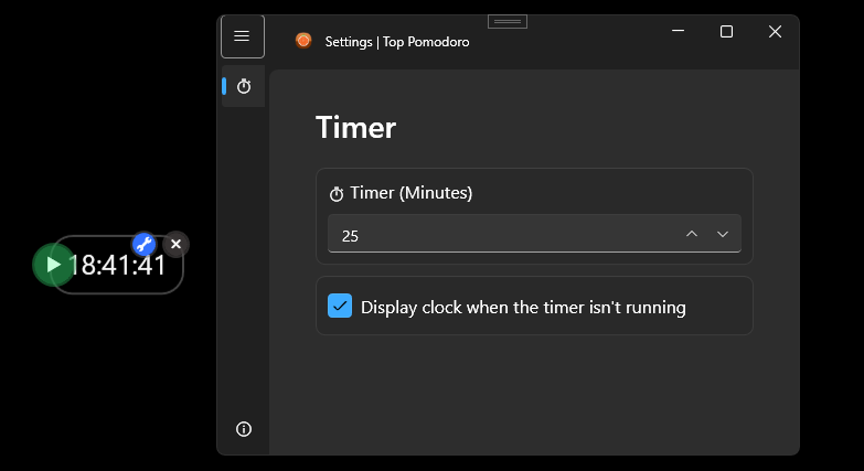 Say goodbye to the distractions and inefficiencies eating up your workday. Presenting Top Pomodoro, the Pomodoro Timer built with elegance, simplicity, and visibility in mind. Unlike any other timer, our app takes center stage on your desktop, staying always visible so you can effortlessly manage your time. Boost your productivity, focus better, and achieve your goals faster — all while enjoying the sheer visual delight our app offers!