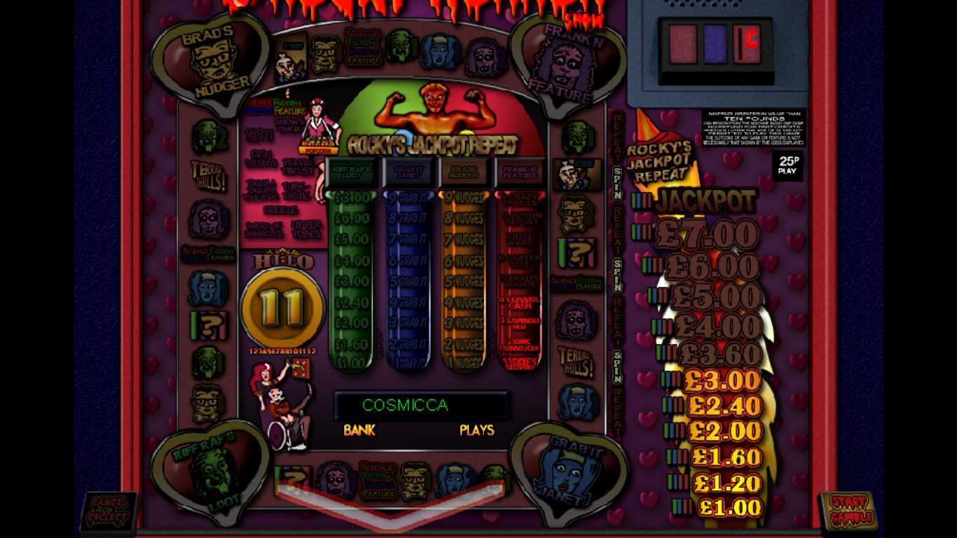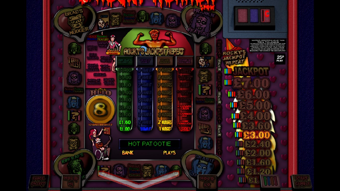 Rocky Horror, The Fruit Machine is a retro, just for fun fruit machine complete with nudges, features and a game board and it’s a perfect way to test your luck! Happy retro gaming!
