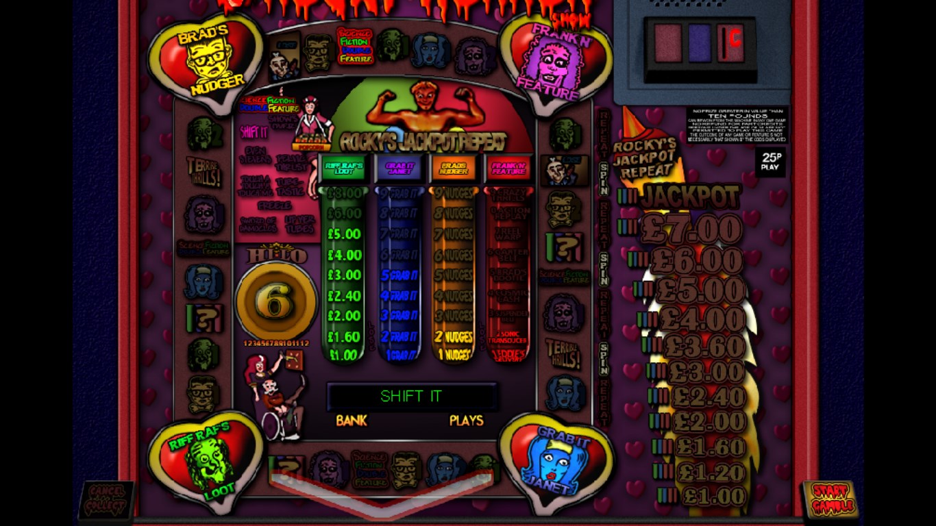 Rocky Horror, The Fruit Machine can be played by touching the onscreen buttons (Or the corner game board icons, a real help for smaller screens) or by using a mouse-which covers most devices so happy retro gaming, all you need to provide is some real luck...