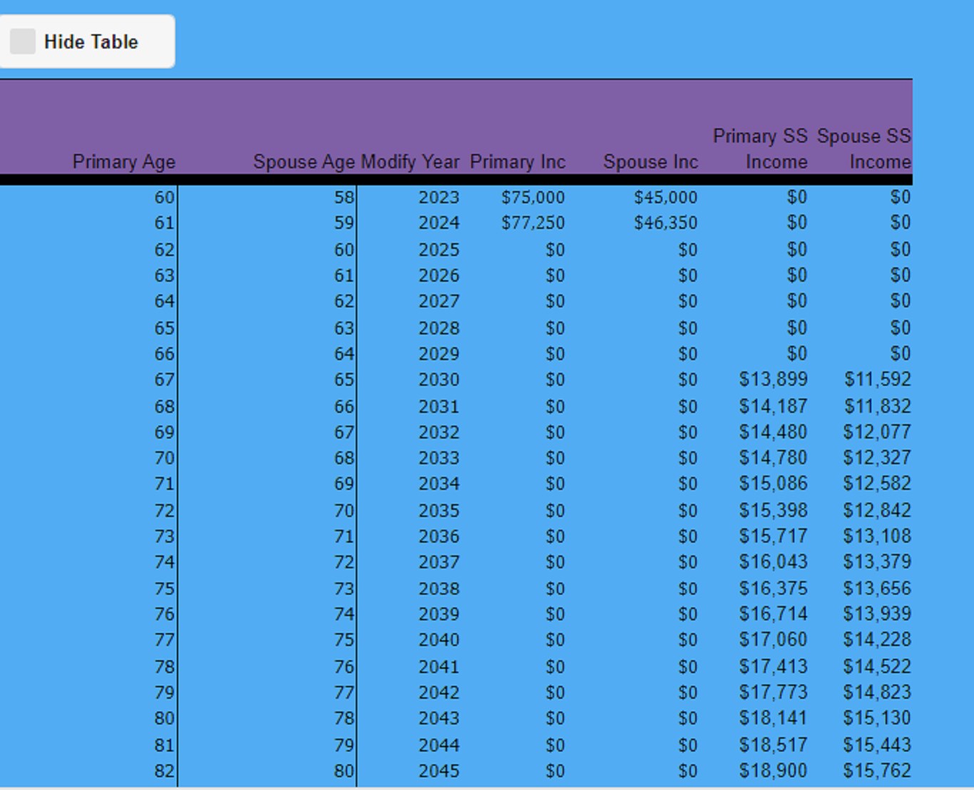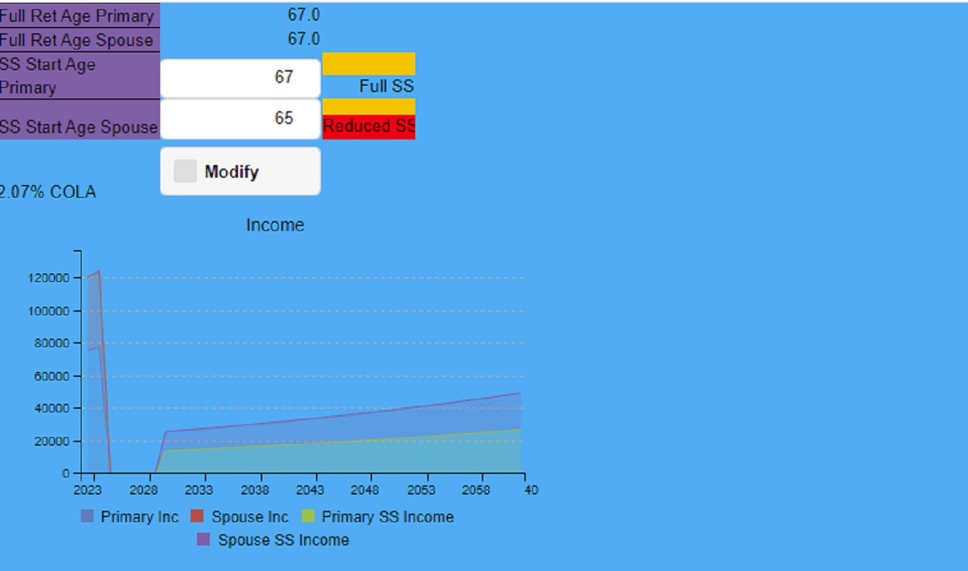 Social Security Calculator projects your expected social security income for you and your spouse until end of plan. Social Security Calculator uses the same methodology that SocialSecurity.gov does so you do not have to go to a government web site to determine your social security income. It shows a nice graphical picture of your current income as it converges into your social security income. It also provides a full data table of all the results. Takes into account early/full/late benefits start period for you and your spouse and shows effect of those decisions on social security benefits.