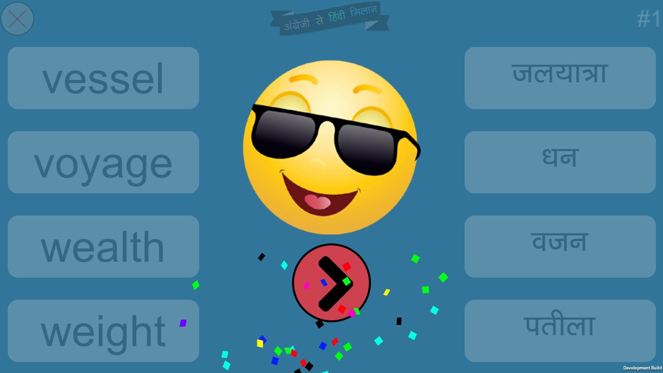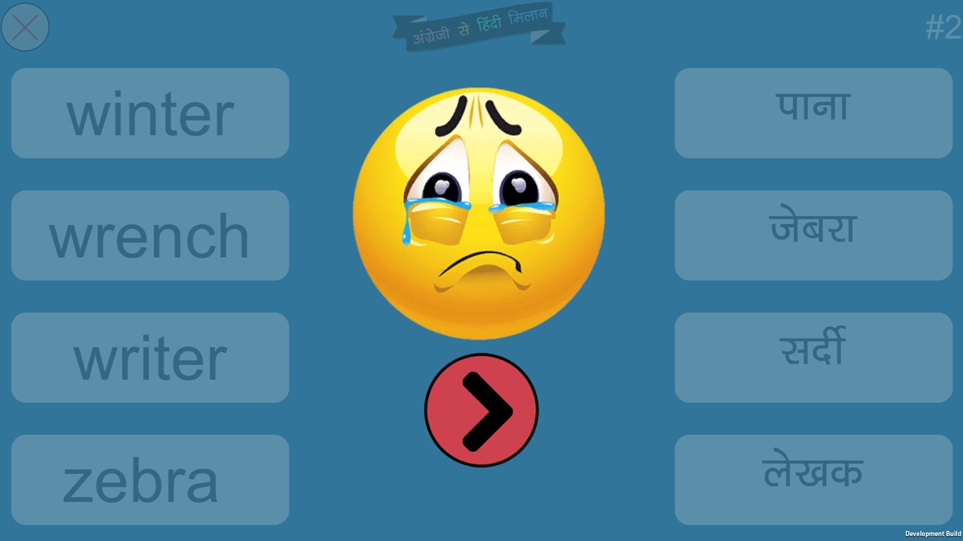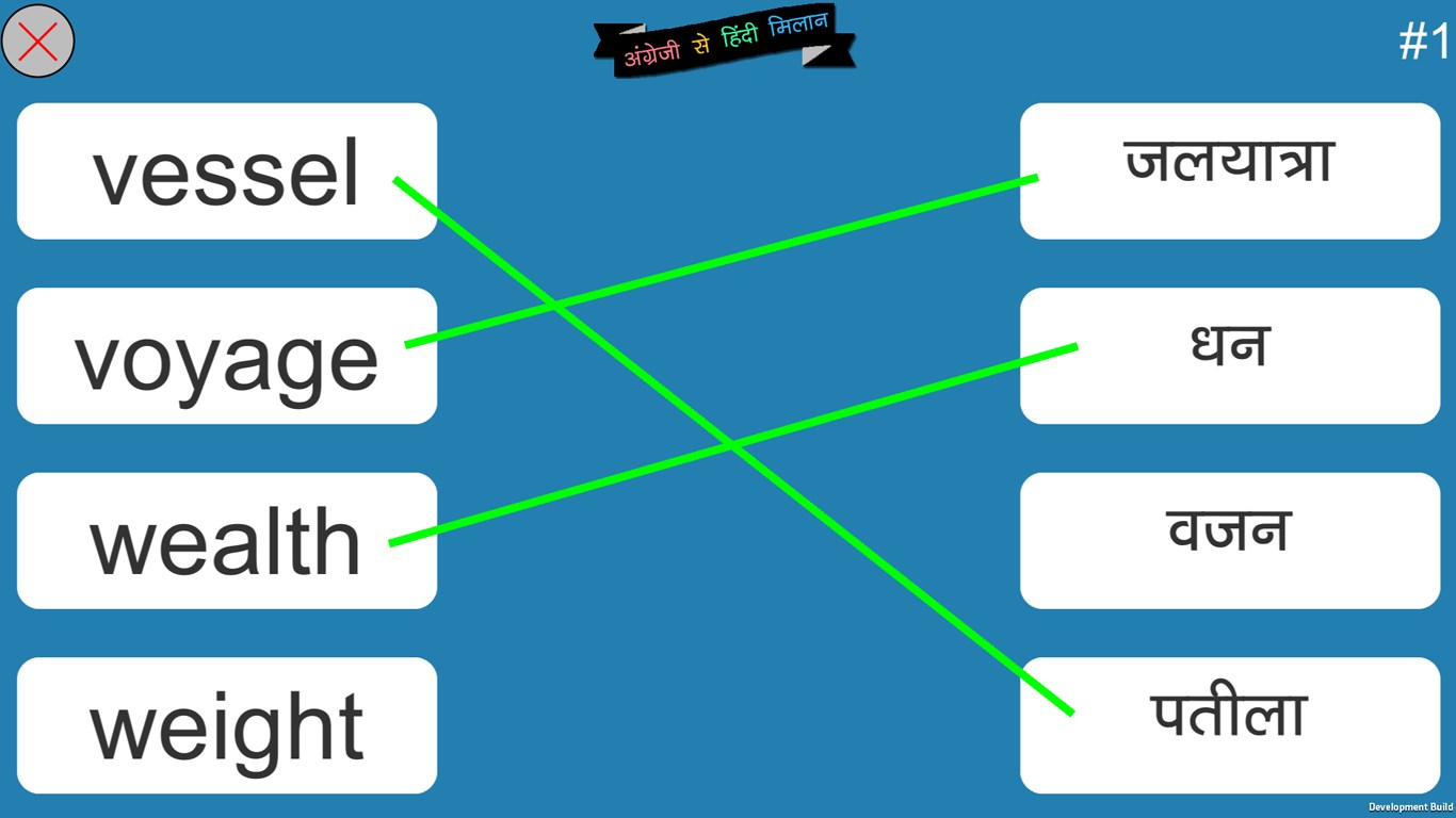 English to Hindi Word Matching4 different categories (Starter, Regular, Amateur and Challenge)Each category has 59 levels to play.900+ English and Hindi Words