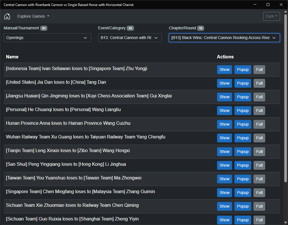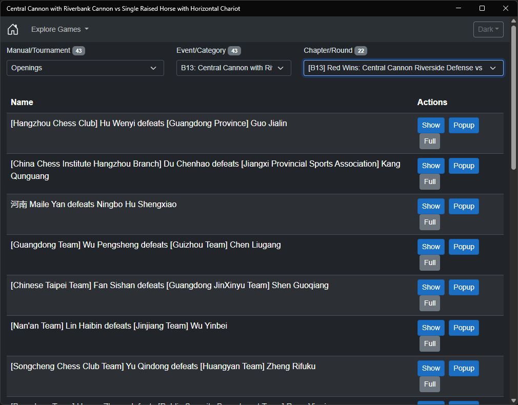Each game showcases practical applications of the Central Cannon with Riverbank Cannon vs Single Raised Horse with Horizontal Chariot opening [中炮巡河炮对单提马横车], providing valuable insights into both strategic planning and tactical execution. This opening, known for its complex interplay between attacking and defensive possibilities, offers rich learning opportunities for players of all levels.