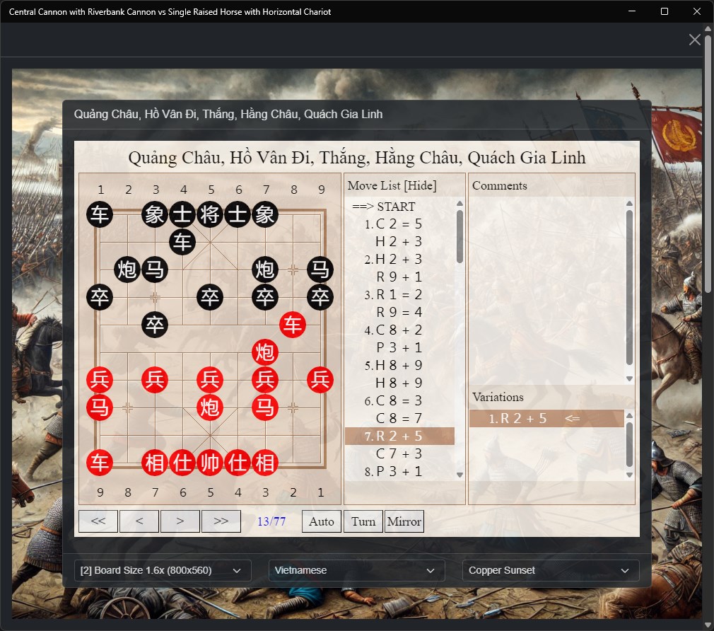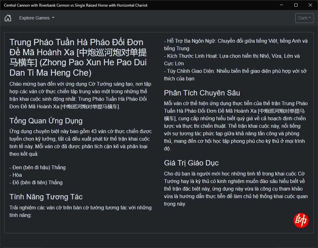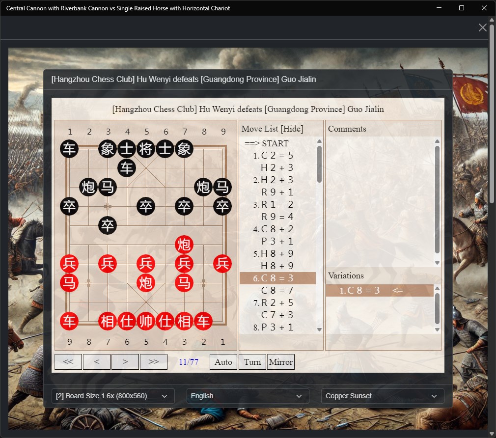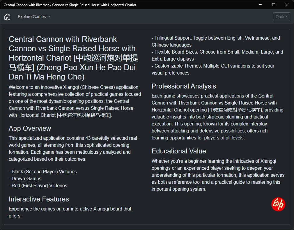 Whether you're a beginner learning the intricacies of Xiangqi openings or an experienced player seeking to deepen your understanding of this particular formation, this application serves as both a reference tool and a practical guide to mastering this important opening system.
