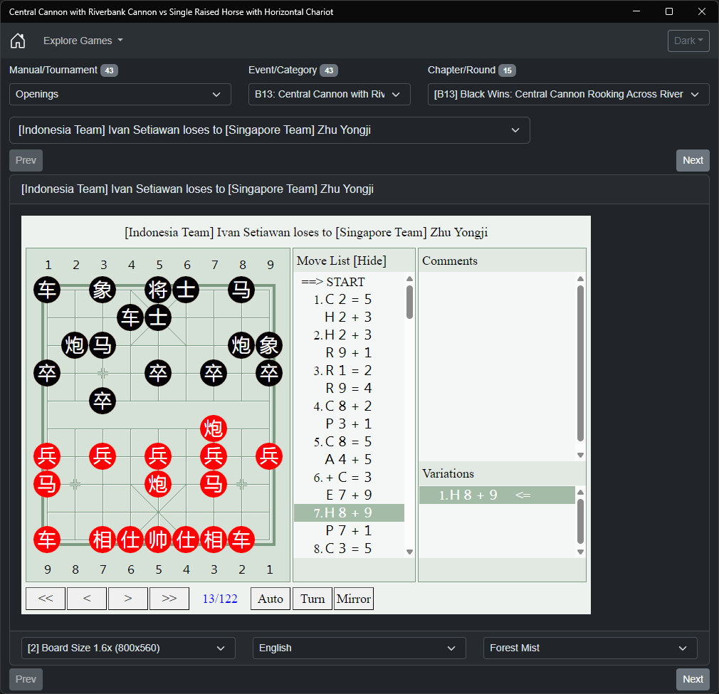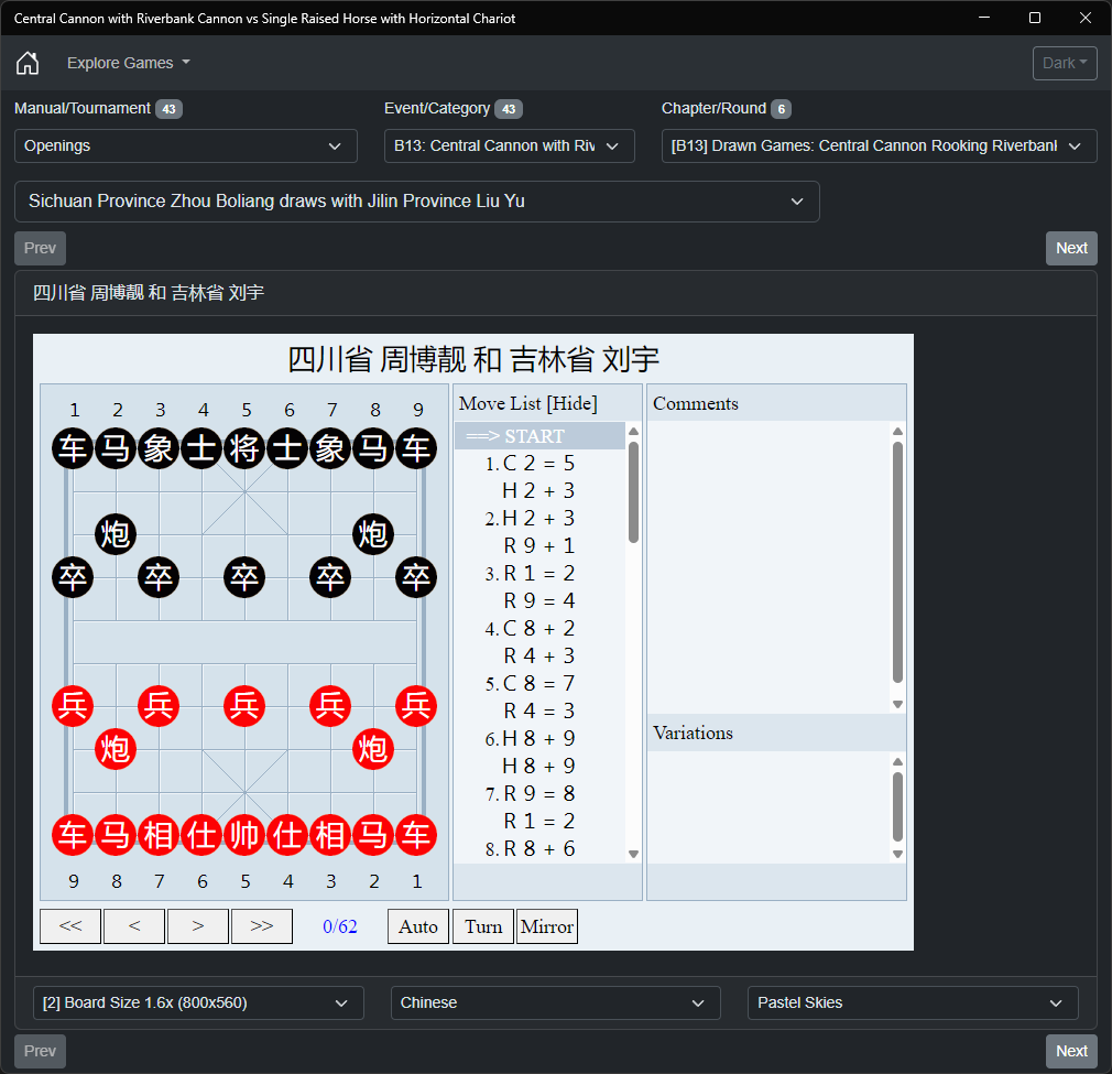 Welcome to an innovative Xiangqi (Chinese Chess) application featuring a comprehensive collection of practical games focused on one of the most dynamic opening positions: the Central Cannon with Riverbank Cannon versus Single Raised Horse with Horizontal Chariot [中炮巡河炮对单提马横车].