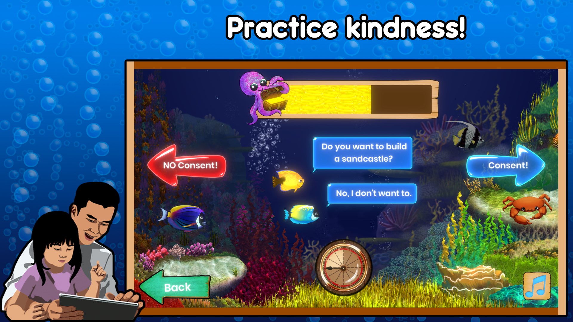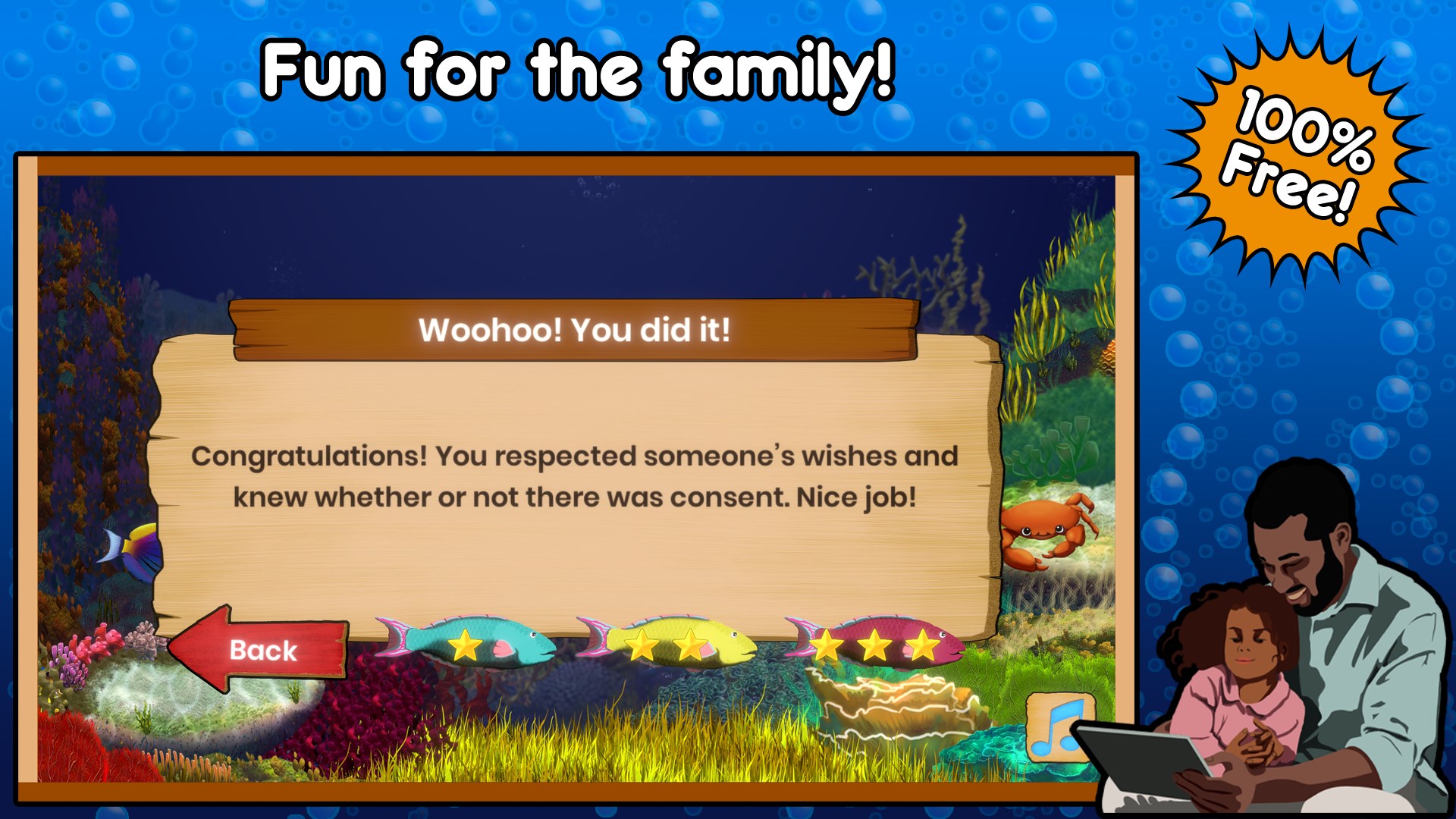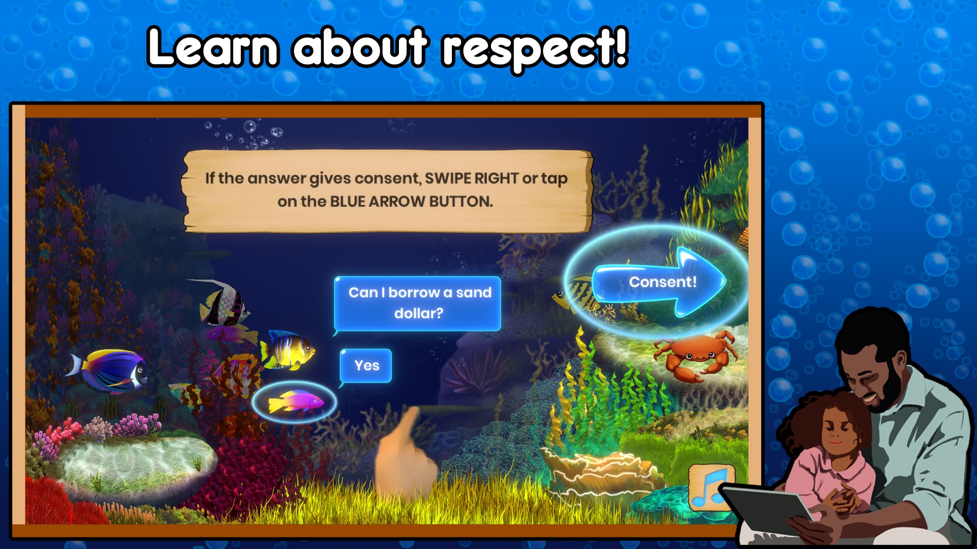 Join us underwater as your child learns about respect and consent! With our colorful band of fishy friends, players grasp the nuances of communication and how to determine if consent was given or not. Fishin' For Permission is designed so your kid can spend less time trying to figure out how to play the game and more time learning and having fun. This game has simple controls and easy to understand directions that are fully voice acted.