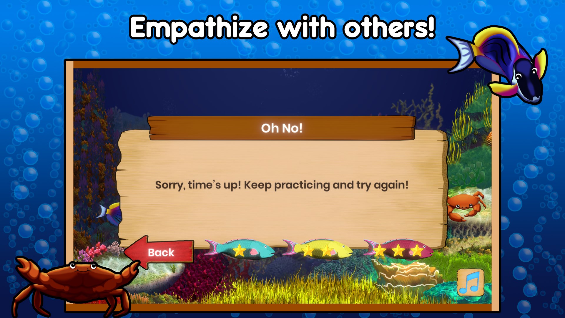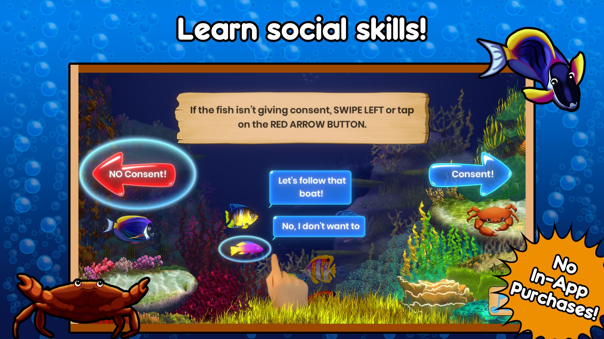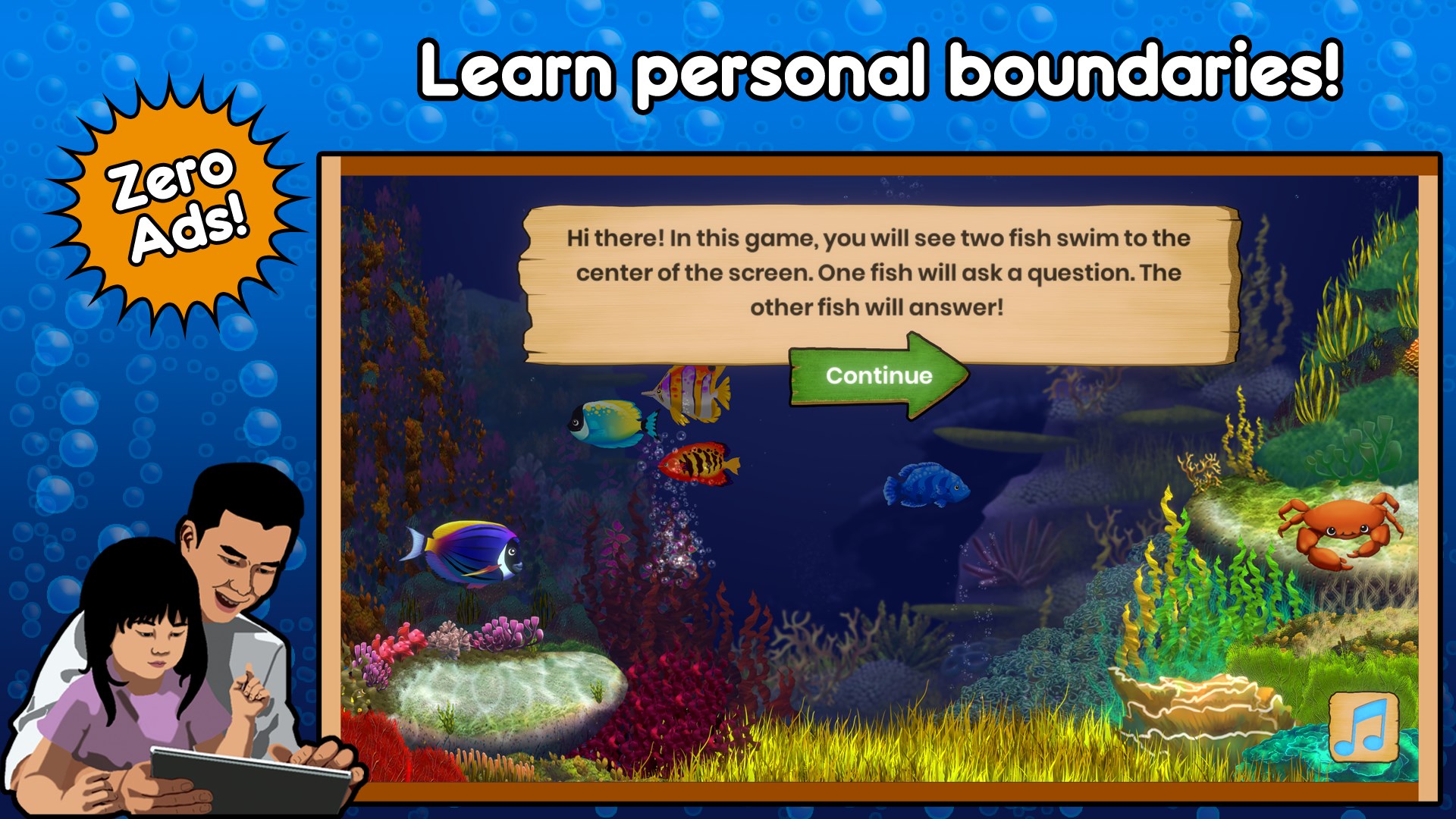 Join us underwater as your child learns about respect and consent! With our colorful band of fishy friends, players grasp the nuances of communication and how to determine if consent was given or not. Fishin' For Permission is designed so your kid can spend less time trying to figure out how to play the game and more time learning and having fun. This game has simple controls and easy to understand directions that are fully voice acted.