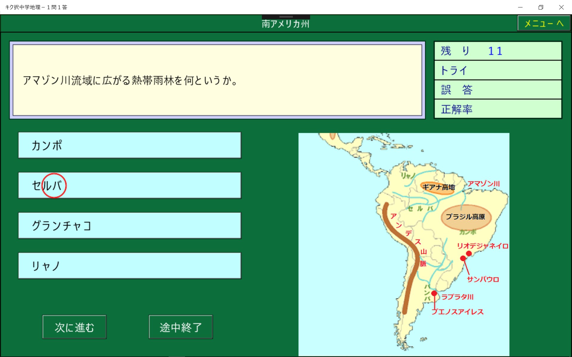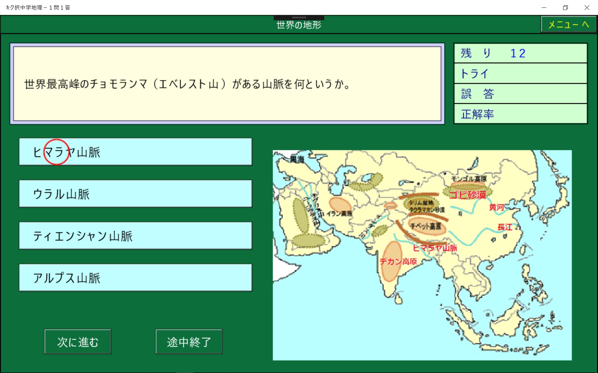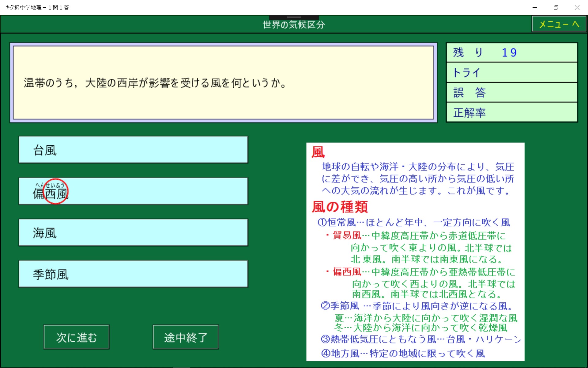 中学地理で学習する事を1問1答形式にしました。正解削除機能により,まちがった問題は繰りかえし出題されます。また,1問ごとに正誤が記録されるので誤答した問題のみを実行することができ,効率よく学習でき時間の短縮になります。音声モードでは問題と解答を聞くことにより学習することができます。
