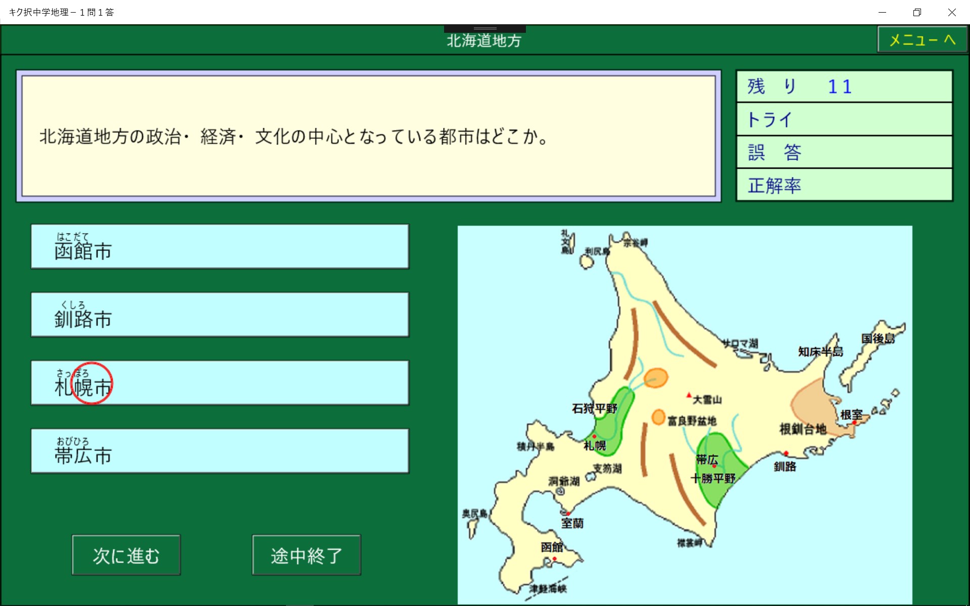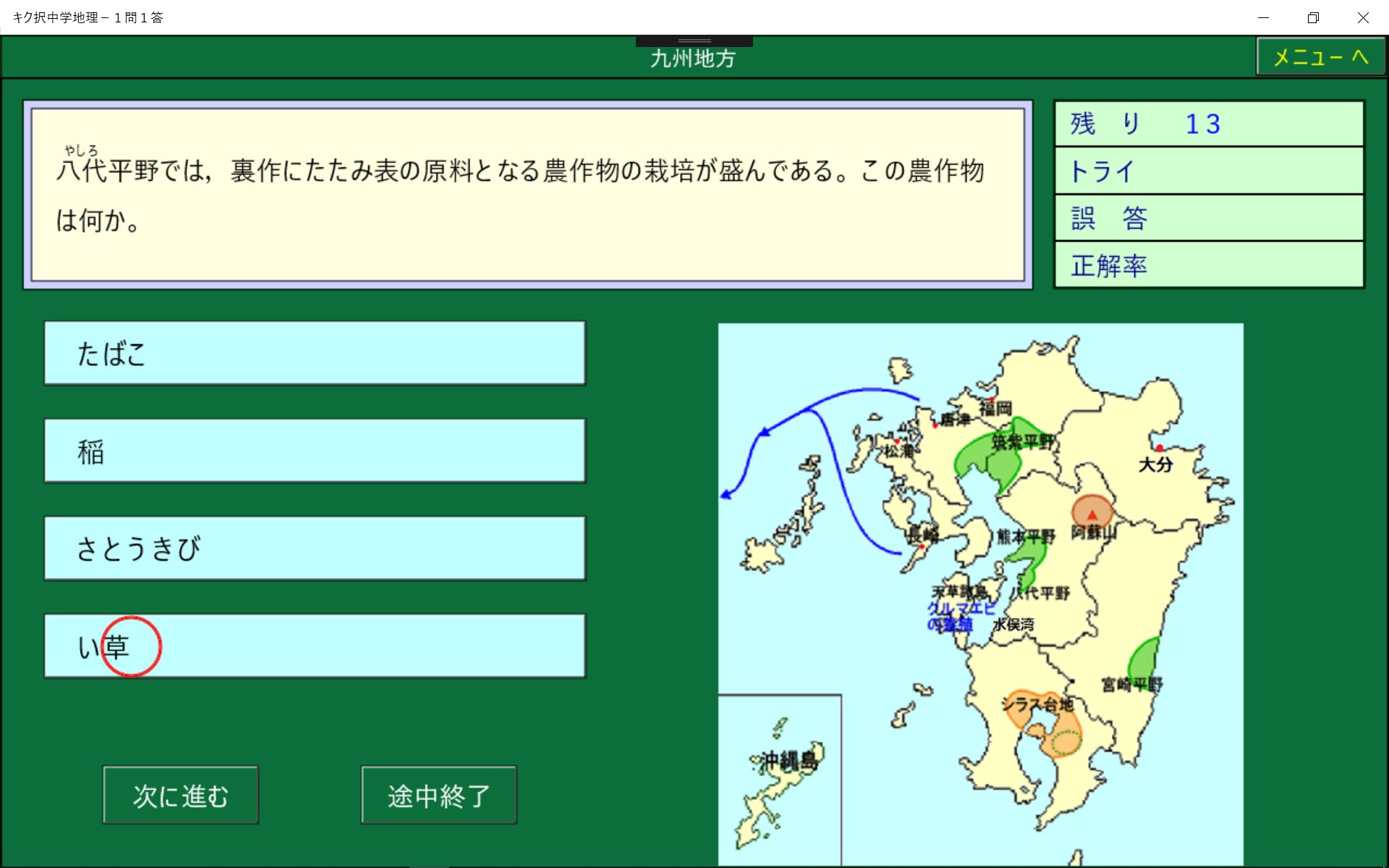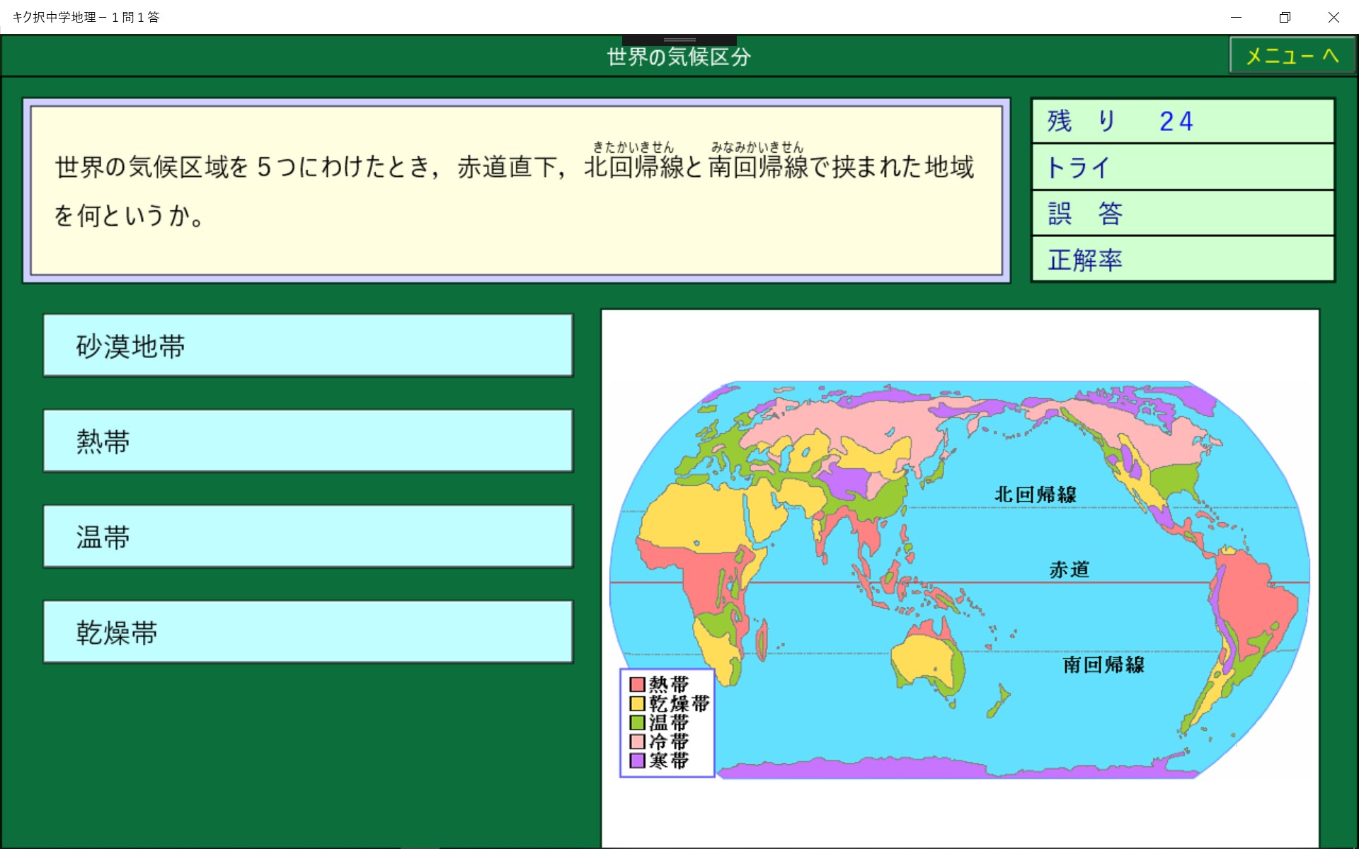 中学地理で学習する事を1問1答形式にしました。正解削除機能により,まちがった問題は繰りかえし出題されます。また,1問ごとに正誤が記録されるので誤答した問題のみを実行することができ,効率よく学習でき時間の短縮になります。音声モードでは問題と解答を聞くことにより学習することができます。