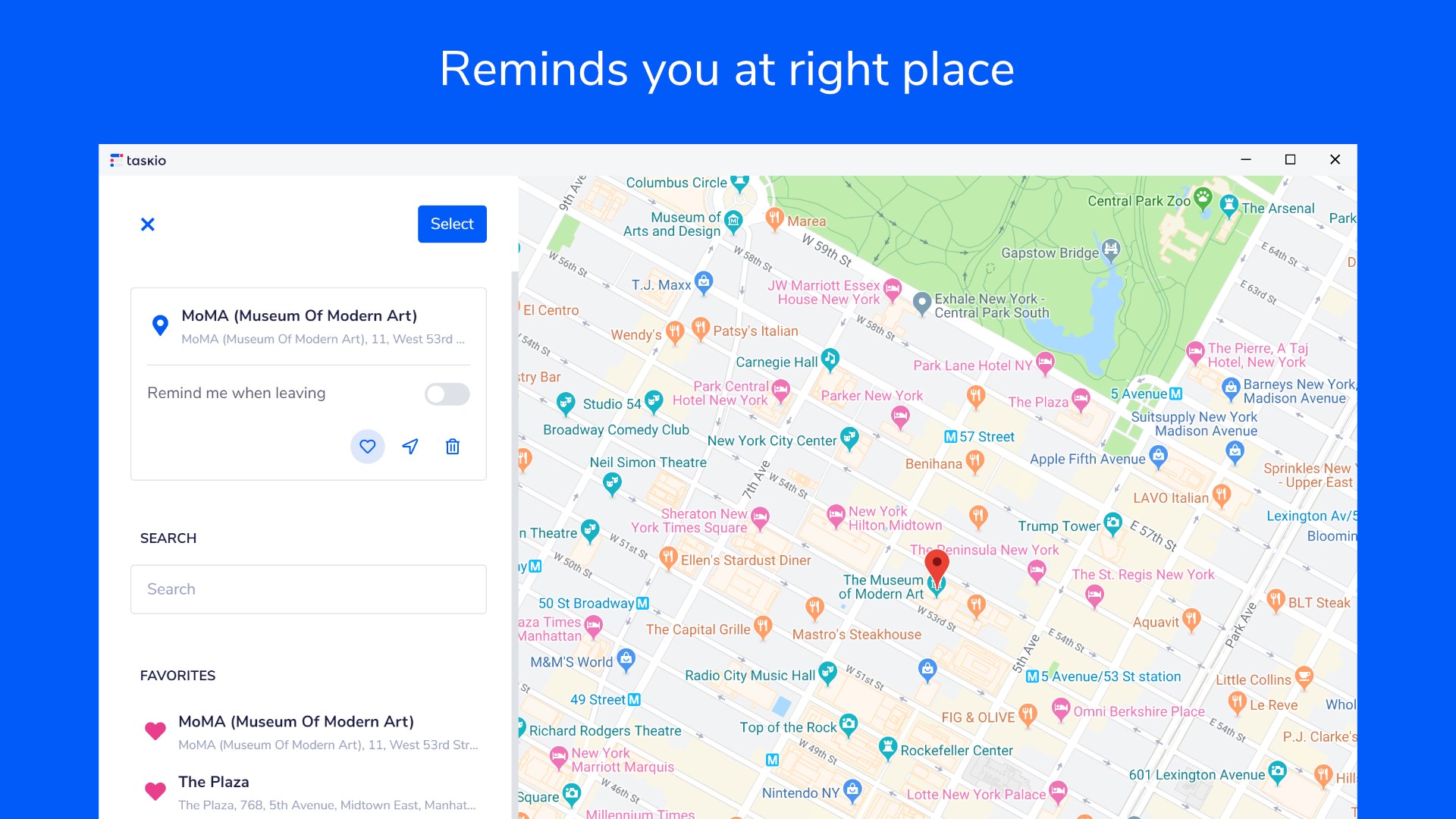- Location based reminders - Get reminded on your tasks at specific location. Pick a location from map or enter street address.