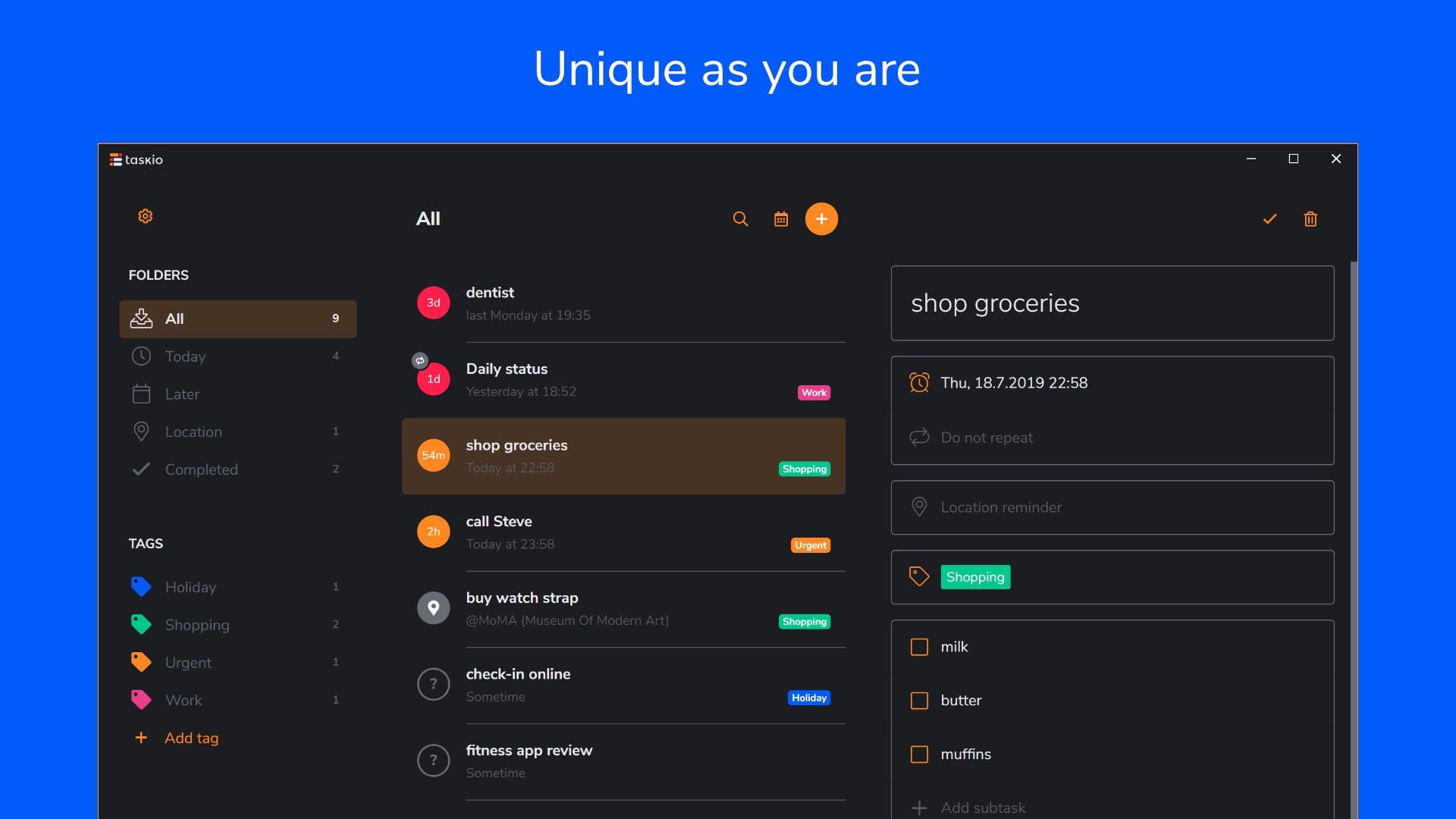 Taskio is free to download and use with limited content available. Taskio Premium gives you unlimited access to Recurrence, Location based reminders, Subtasks, Notes, Tags and Color themes to help you be more productive than ever.