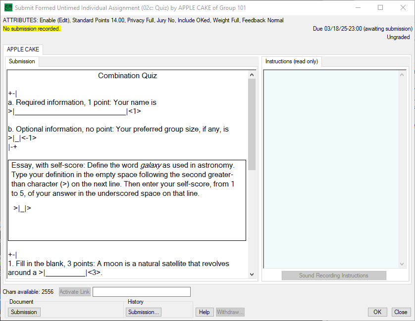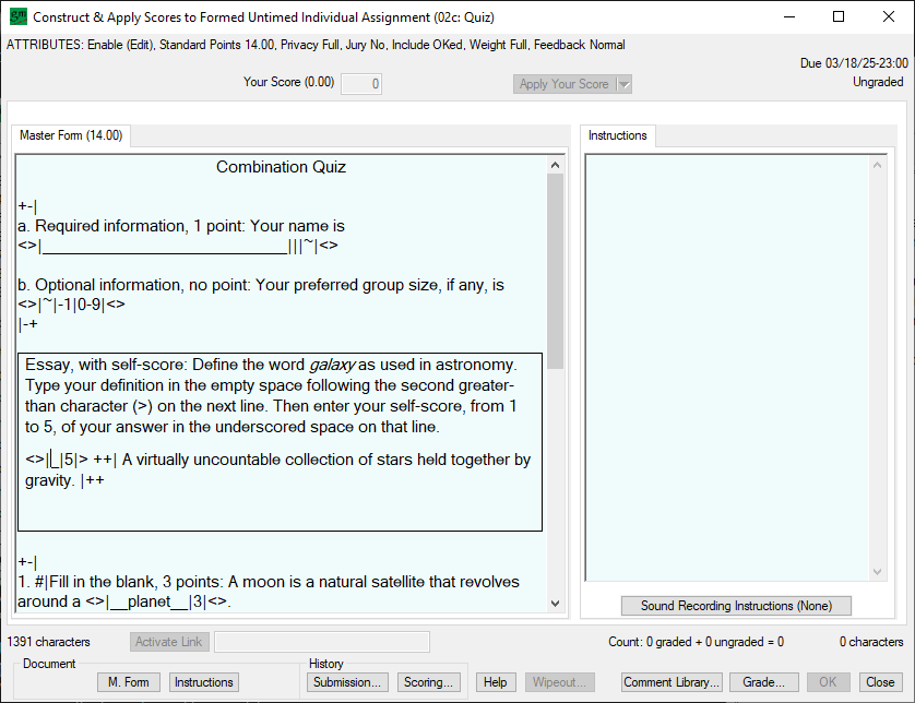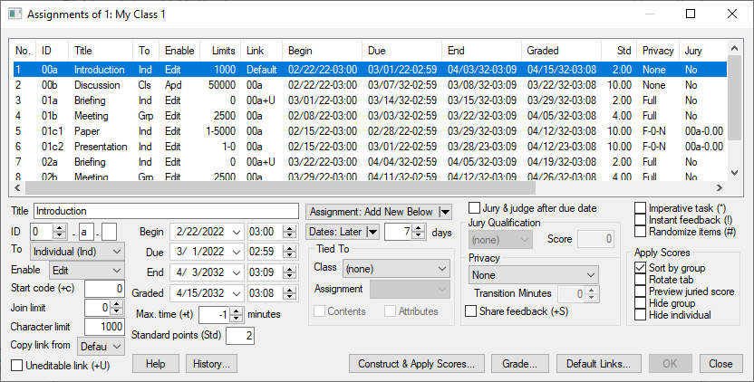 Assignments can target individuals, groups, or the entire classAssignments can be related so that work on one assignment either affects the score of or precludes work on another assignmentFeedback on close-ended assignments can be instant, with credit reduced when successful after repeated attemptsQualified students can jury-evaluate submissionsGrading on open-ended assignments can be a weighted combination of instructor score, jury score, and self-scoreGroup membership can differ across assignmentsGroup membership can be self-selected, set by instructor, or set by rulesGroup leaders can be selected and de-selected by the votes of group membersGroup leaders can limit the ability of members to change group submissionsGroup members can validate each other\’s engagementCredit for submission of group and class assignments can be conditioned on engagementSubmissions can be constrained by length and formatPrivacy of submissions can be varied and set to change after assignment due datesHistory of actions taken is time-stamped and available for action-taker\’s reviewHelp is context sensitiveData is archived regularly and available for everyone\’s reviewRegistration can be shared with a business game or another application