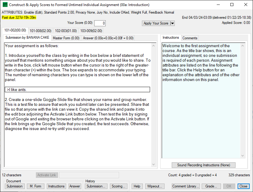 Inasmuch as this version of GroupMaker operates in public space, what one shadow instructor does can be undone by another, and no student is obliged to enter a real identity at registration. Contact us to reserve space for your class and remove shadow-instructor access. There is no charge for the service.