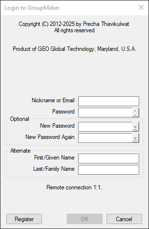 Students register by clicking the Register button on the opening “Login to GroupMaker” panel, proceeding from there to enter instructor-required information and act on assignments constructed by the instructor (File > Action > Assignment). The instructor can edit student-entered information (File > Administration > [select registered name] > Edit).