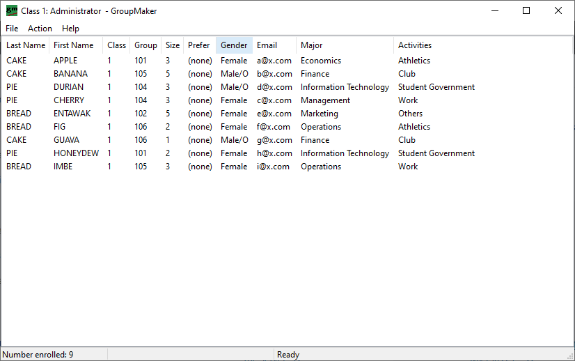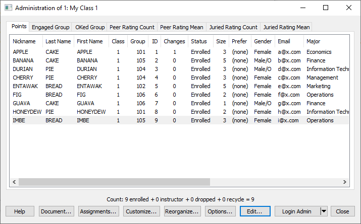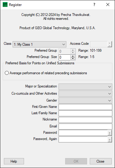 Instructors wishing to explore features can assume the identity of one of five shadow instructors, each associated with students in the shadow instructor’s classroom. To assume a shadow instructor’s identity, at the application’s opening Login-to-GroupMaker panel, type a numeral between 1 and 5 in the Password edit box, leaving all other edit boxes empty. Then click the OK button. The numeral entered allows the shadow instructor to access the numeral-designated classroom (My Class #) and open registration (File > Administration > Options > Open registration) for students to enroll in the class.