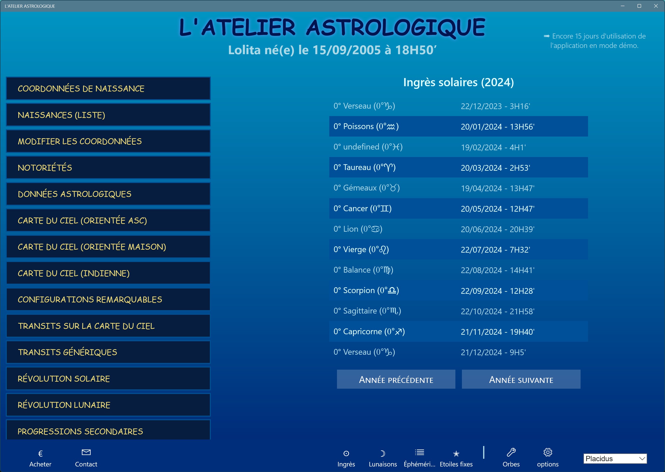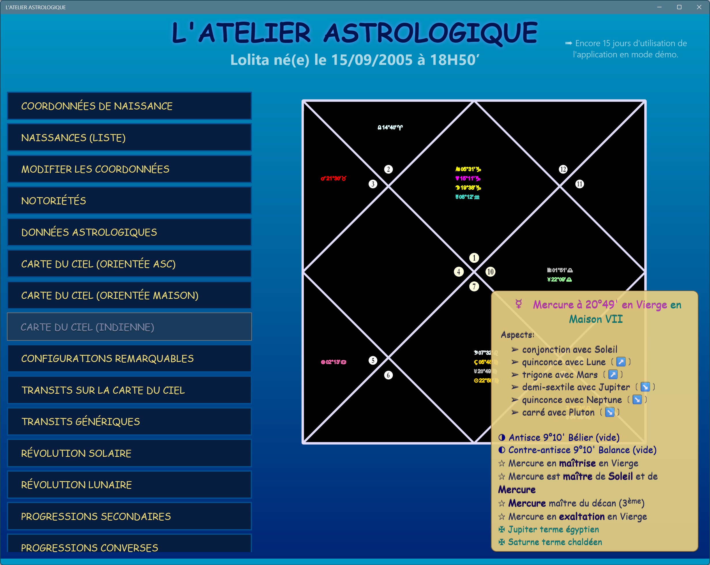 Nous avons développé les outils et calculs indispensables utilisés par la plupart des astrologues. Si une fonctionnalité vous manque, n'hésitez pas à nous le signaler ; dans la mesure du possible, nous l'ajouterons à la nouvelle version. ([email protected]) –