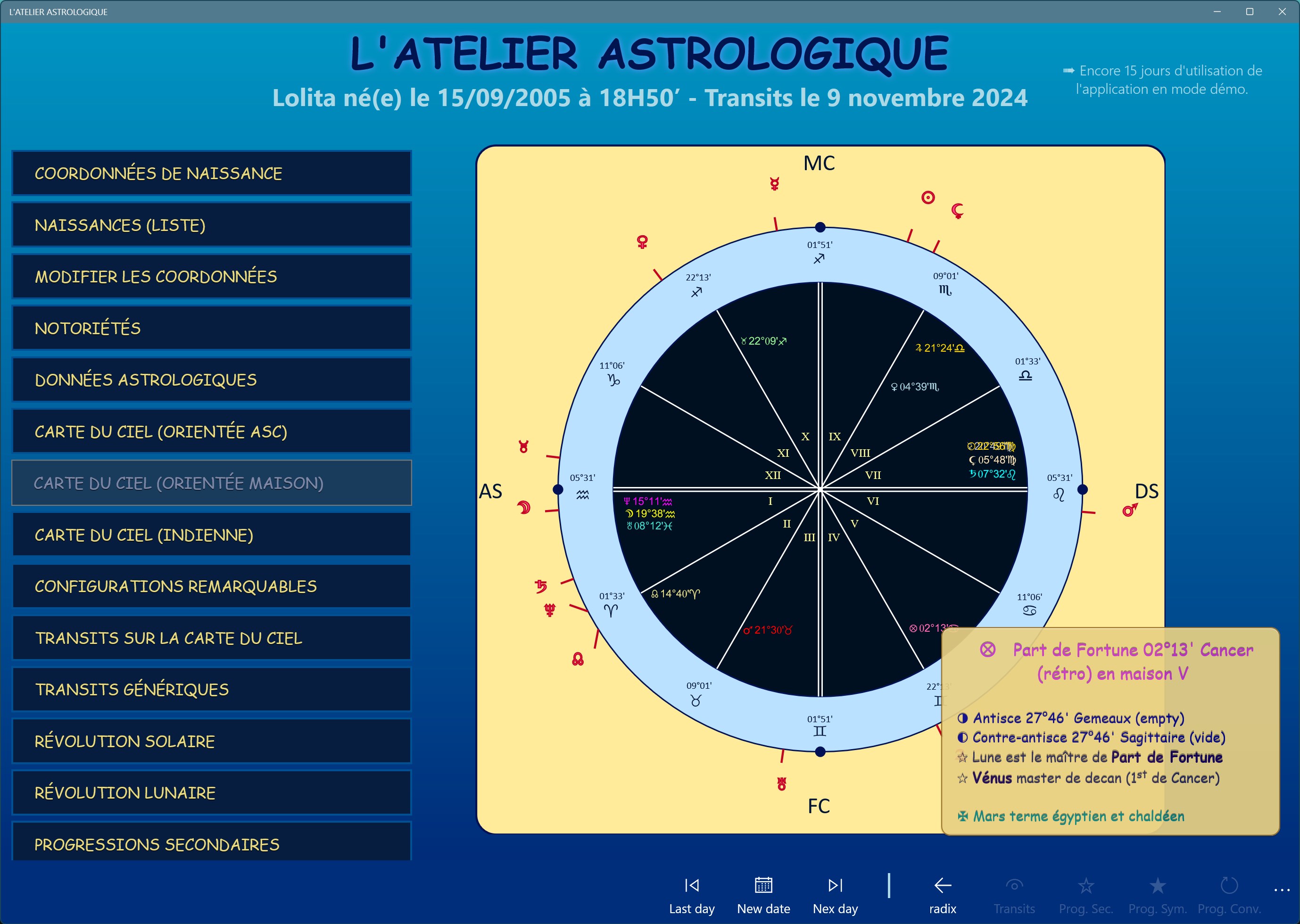 ➼ Outils de prévision astrologique : visualisation sur la carte natale des transits planétaires (pour toutes dates passées ou futures) ou progressions secondaires / symboliques, conversées (pour tous les âges de la vie)