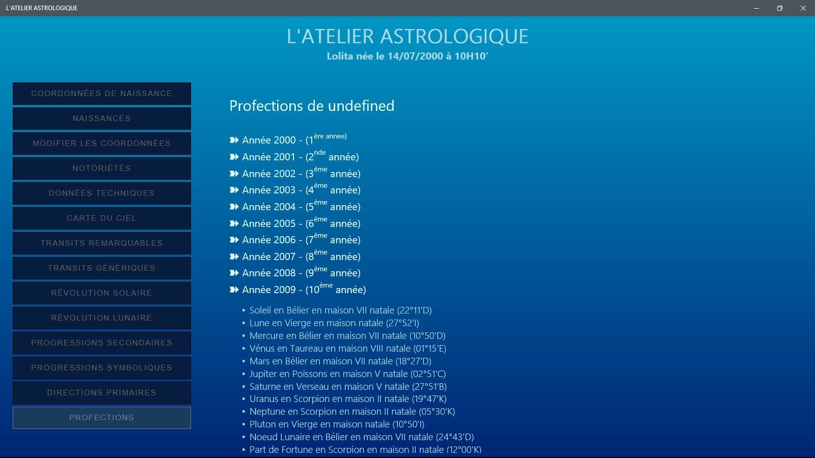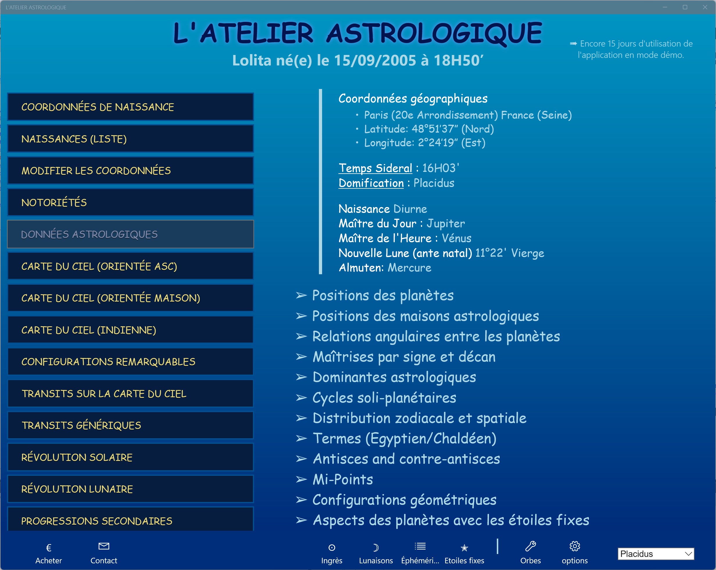 calculs des positions planétairesdessin de la carte du cieldomifications multiples (Placidus, Capenus, Regiomontanus, Kork, Porphyre, Morinus, Meridienne, Maisons égales)calcul des transits et election des configurations remarquablescalcul des transits génériquescalcul des révolutions solairescalcul des révolutions lunairescalcul des directions primairescalcul des profectionscalcul des nouvelles lunescalcul des ingrès solaires (changement de signe zodiacal)calcul des éphémérides du moisvisualisation des transits planétaires sur la carte natale (pour toute date passée ou future)visualisation des progressions secondaires ou symboliques sur la carte de naissance (pour tous les âges de la vie)calcul des progressions conversesListe des étoiles fixesCalcul des relations angulaires des planètes avec les étoiles fixesCalculs des principaux astéroïdes utilisés en astrologieAffichages des principales étoiles fixes reconnue répertoriées par la tradition astrologique.Calcul des parts arabesCalcul du maitre du jour et de l\'heureCalcul de la Syzygie ante natale