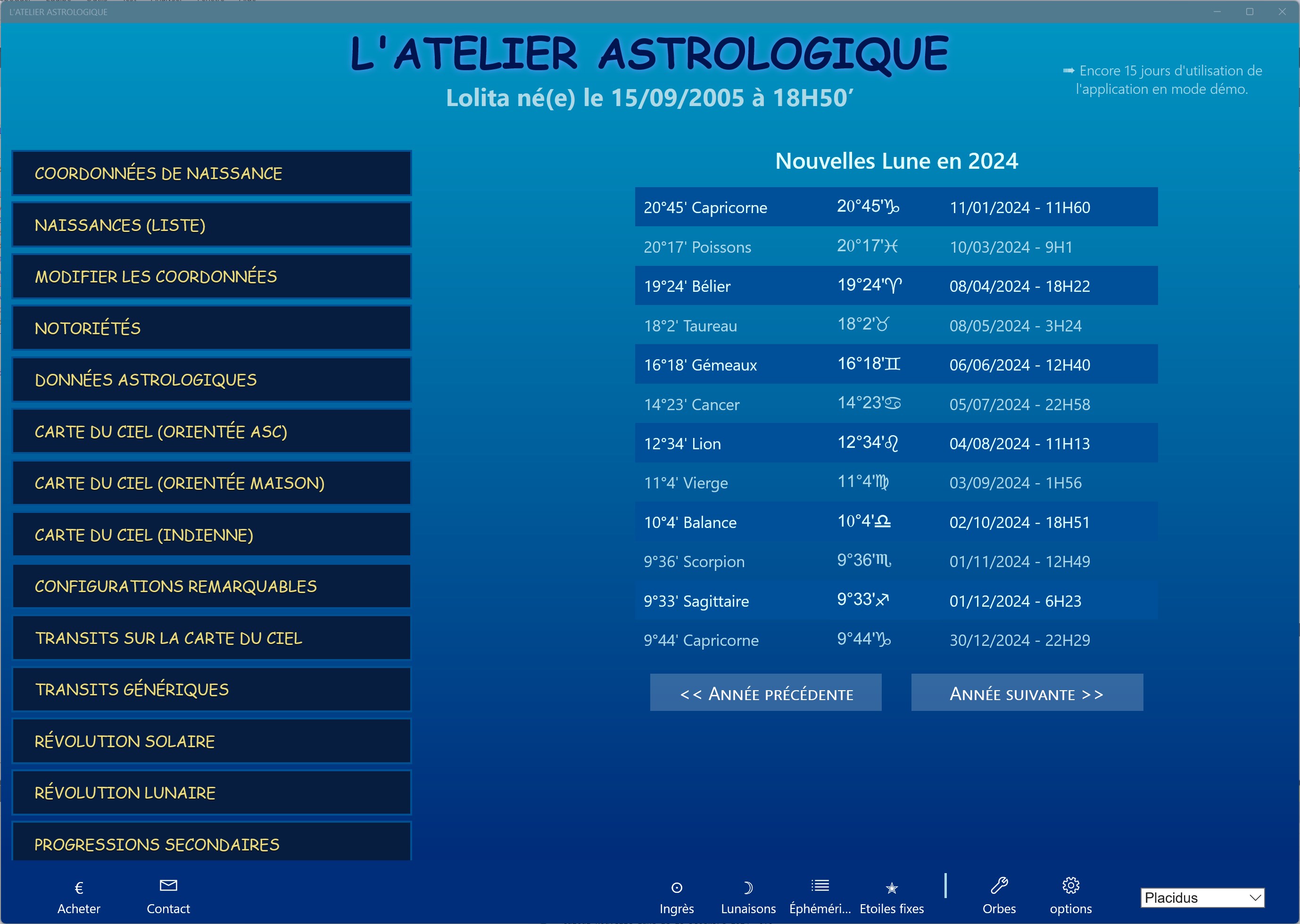 Sa base de données intégrée vous permettra de sauvegarder autant de dates de naissance (et donc de natifs) que vous le souhaitez. Vous disposerez de toutes les fonctionnalités possibles des calculs astrologiques : ces données sont disponibles instantanément et lisibles sous plusieurs formats.
