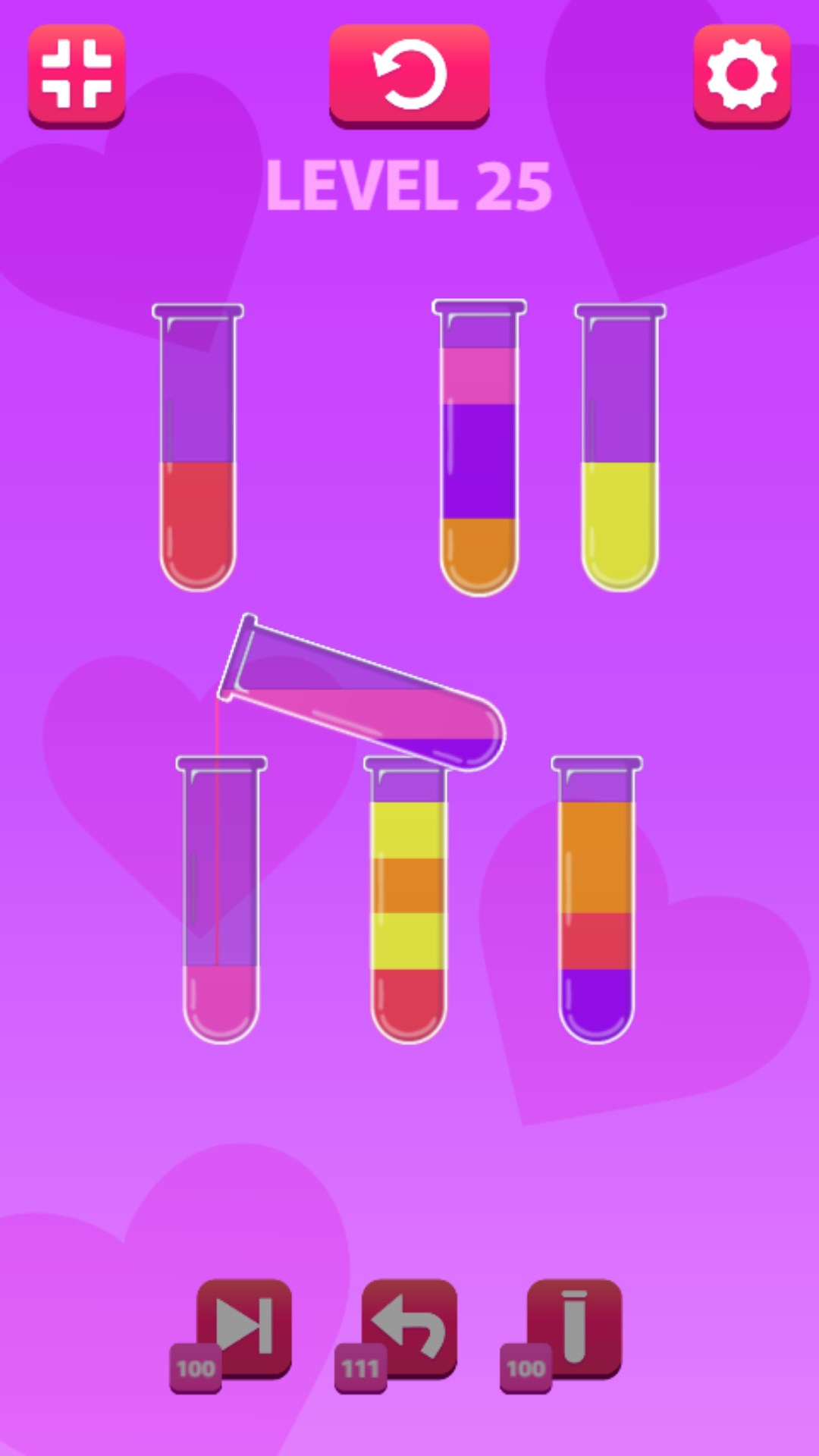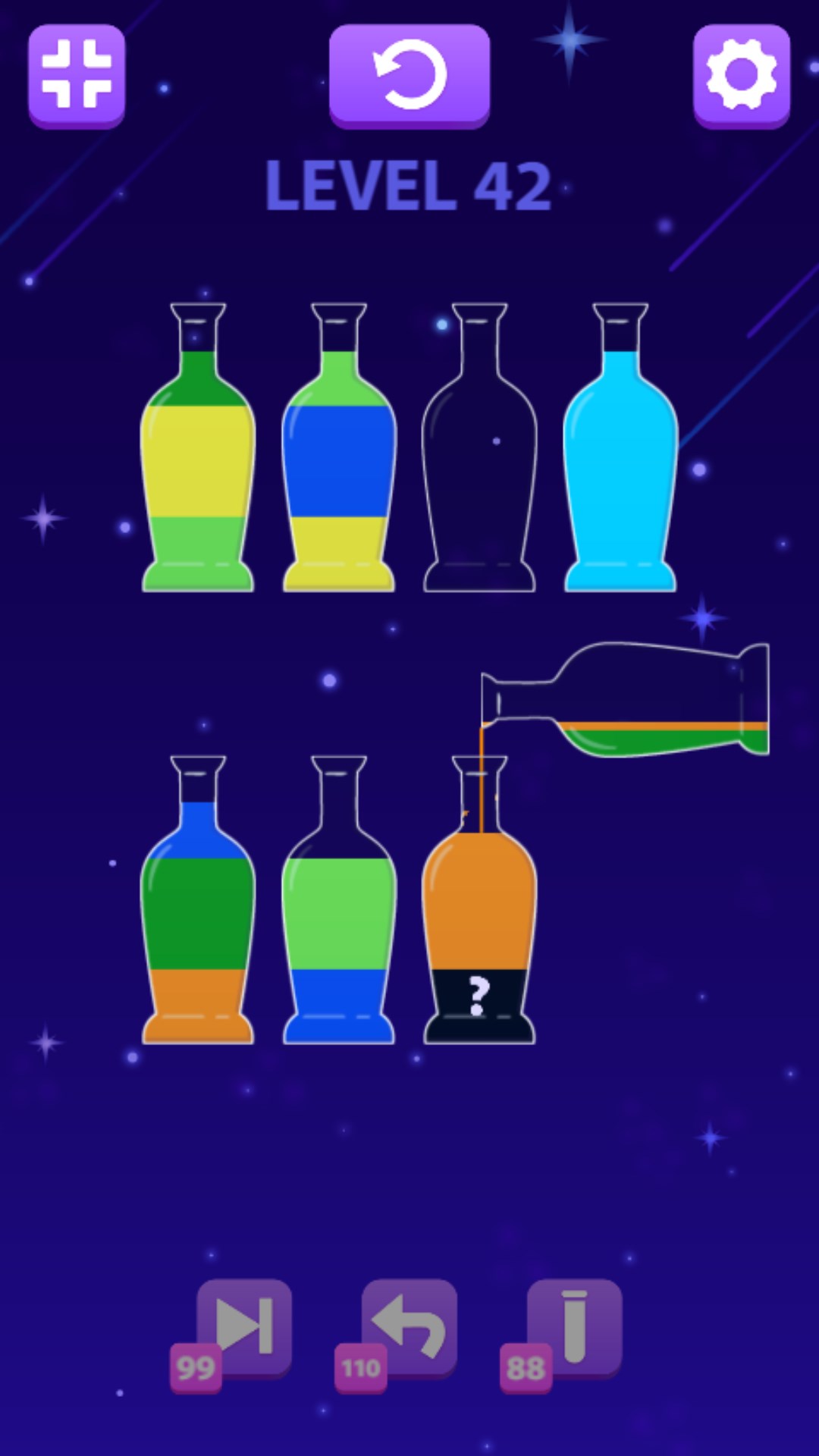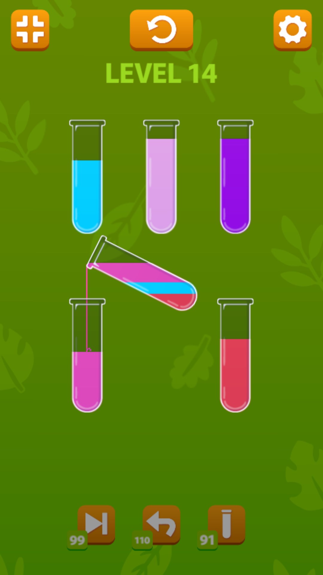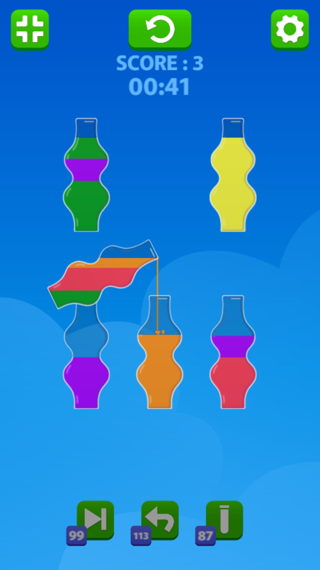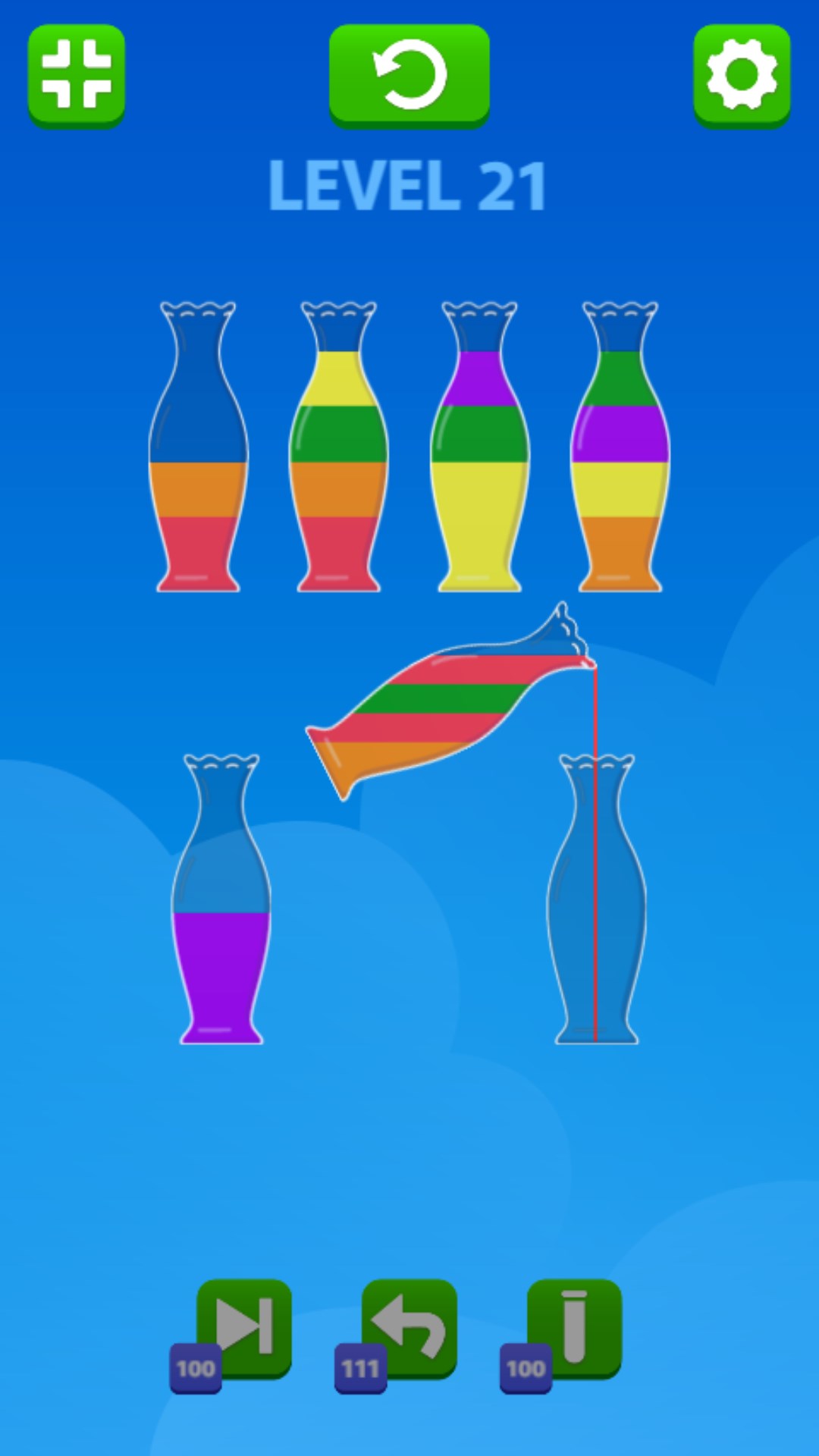 Click on the flasks to move the colored water on top from one to another. Make sure water of the same color is in one flask to pass the level. Use the power-ups in case you get stuck or don't know how to proceed.