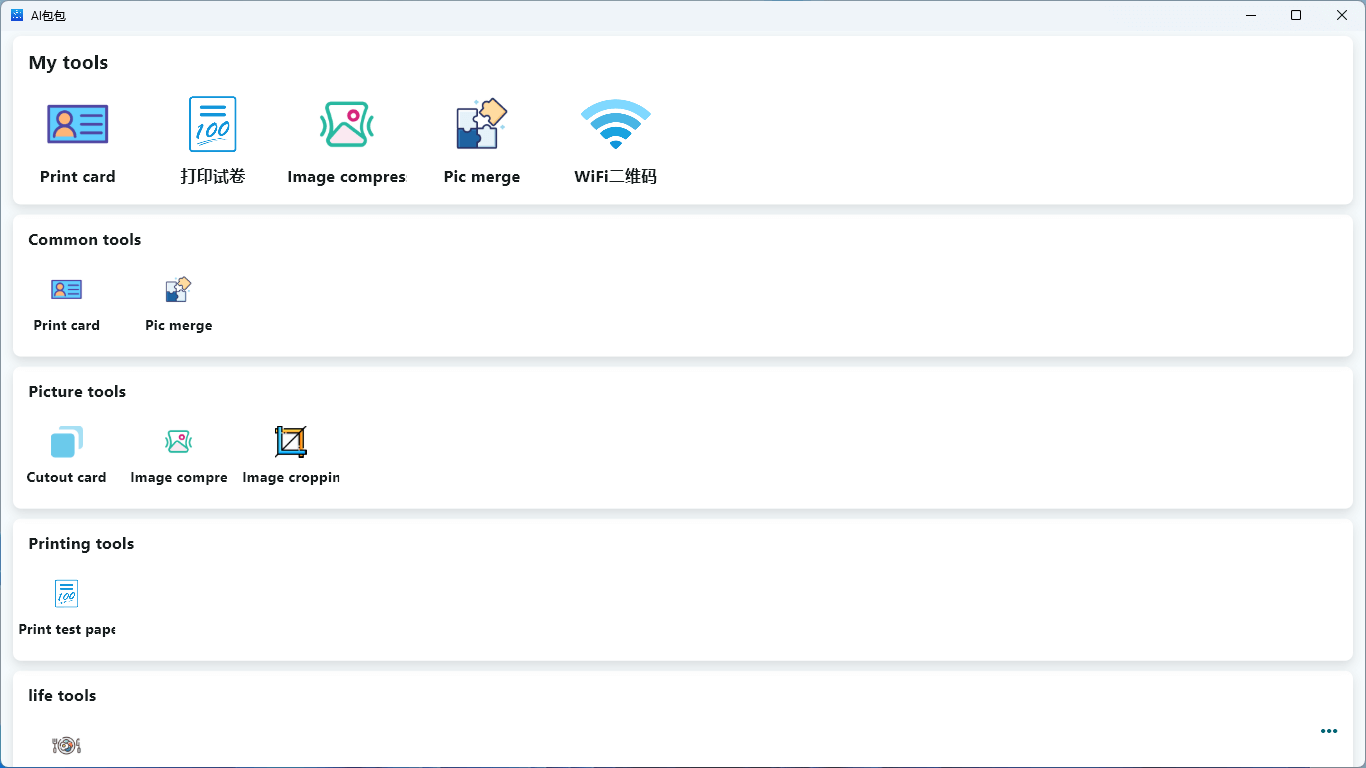 ID card PrintingImage compressionImage stitchingImage croppingQR code generationChinese to Pinyin conversionTraditional Chinese conversionWhat to eat todayJSON comparisonJSON formattingTest Paper PrintingWiFi QR Code