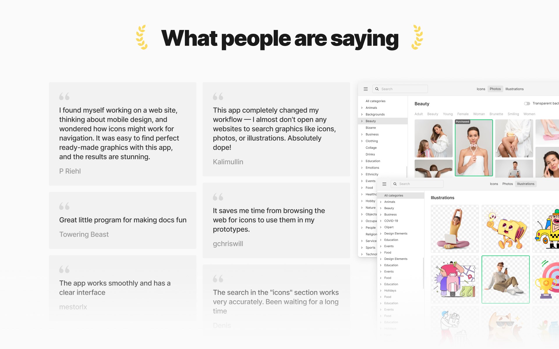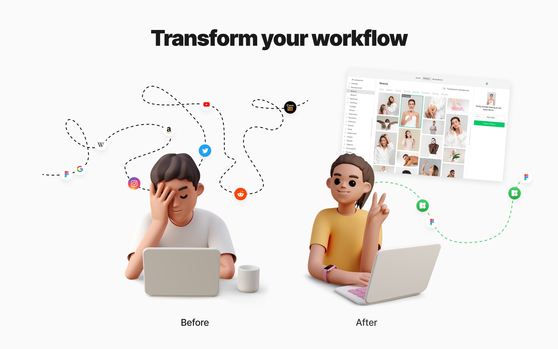 Pick any icons, photos, or illustrations, and drop them into the design tool of your choice. You won't waste any more time searching for the perfect image!