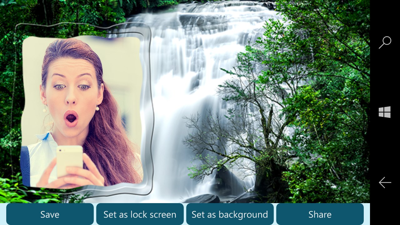 If you download this application you will have plenty of different waterfall photo frames to enrich your photos. Choose a picture from the gallery or take a picture of yourself or your loved ones and use photo frame effects on them. Save those beautifully decorated pictures in your device or share them through social networks. Download favourite waterfall frames, use it all the time and transform old pictures in new. Lively color frames will enhance every picture, even boring ones will look very cheerful. You will have the best framed pictures for sure! Popular and colorful frames with waterfall picture frames that everyone will love.