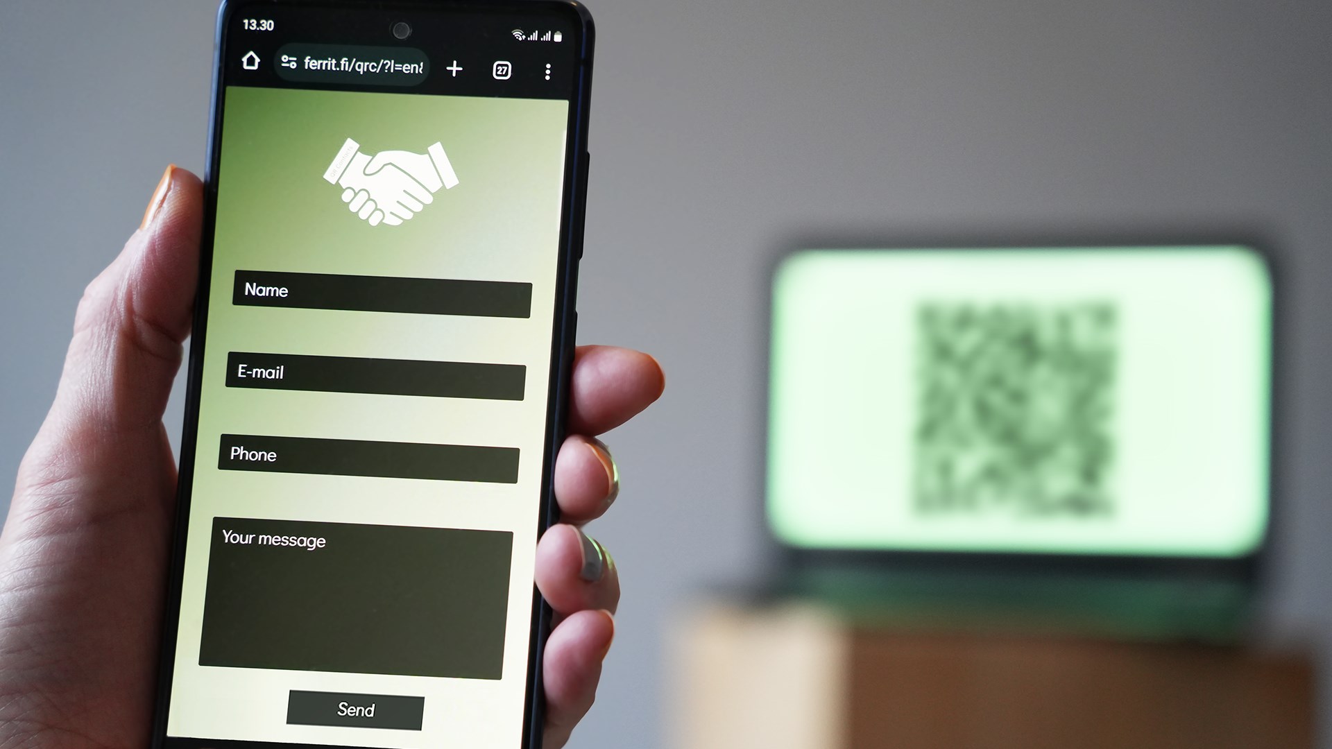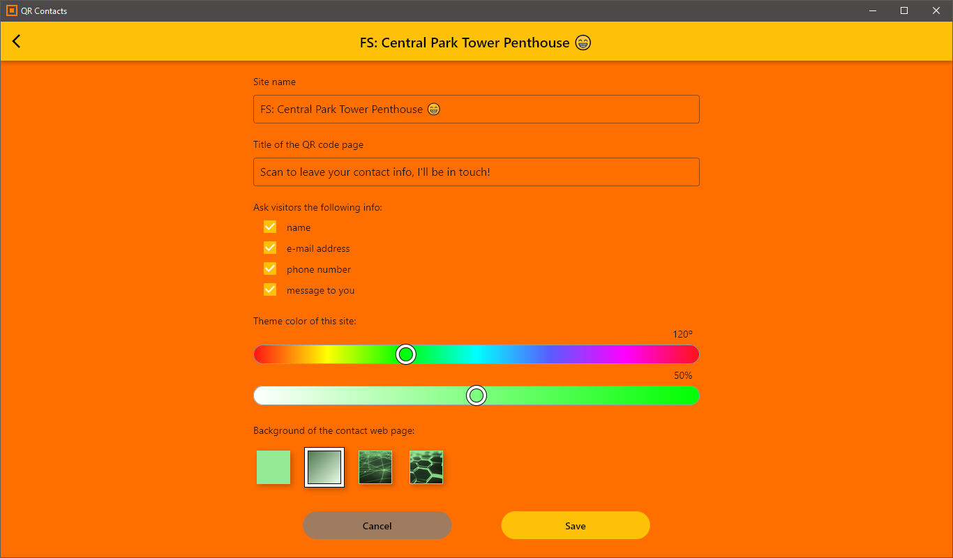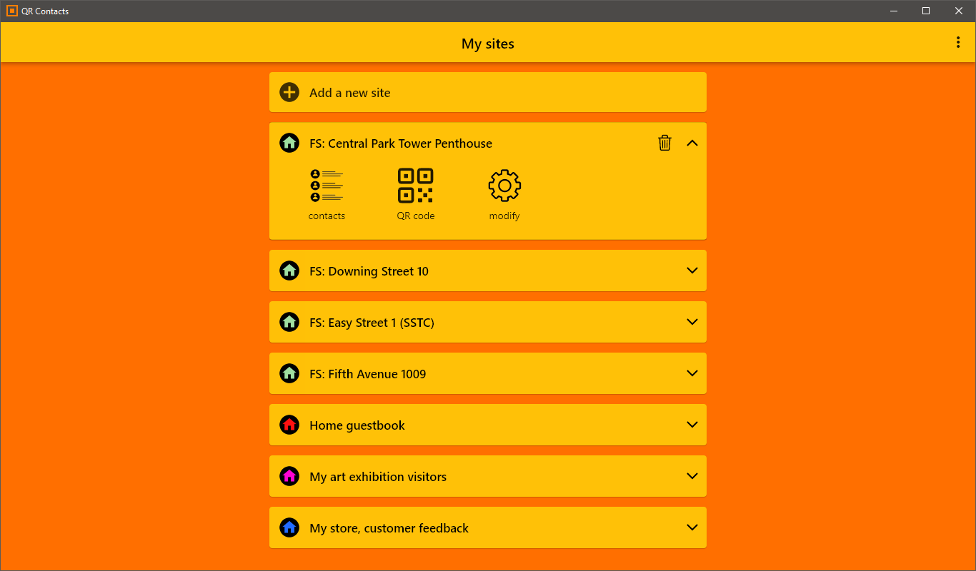 In your QR Contacts app you may add as many sites as you need for collecting contacts, for example one per property. For a site you'll give a name and define which contact details you wish to ask from customers. You'll be also able to customize the style of the web form to your liking. QR code for each site is then available in the app for you to present to visiting customers. You can show it directly from your device, or have it printed or displayed on a laptop or tablet screen.