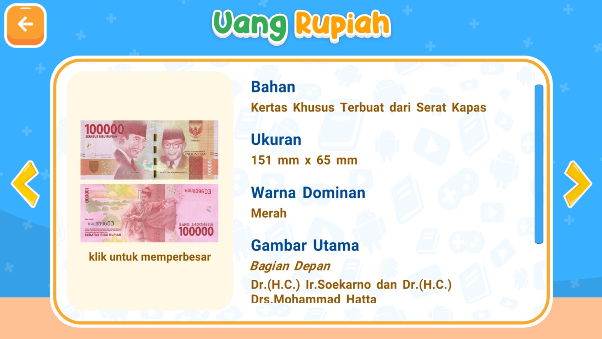 Pada pemainan ini adik-adik akan belajar mengenal berbagai macam pecahan uang rupiah, selain itu adik-adik juga dapat memainkan permainan tukar uang rupiah dan juga permainan bayar belanja yang disimulasikan seperti sedang berada di kasir toko. Dengan begitu adik-adik tidak hanya belajar mengenal pecahannya saja, tetapi juga belajar dan bermain untuk menggunakan uang rupiah tersebut.