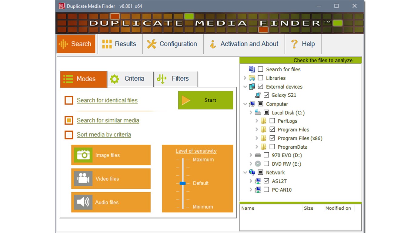 Free up storage space by deleting redundant files, you will free up space on your hard drives, smartphones or cloud (OneDrive, DropBox, Google Drive, iCloud).Simple to use: All you need to do is check the folders to analyze and DMF will do the rest.Sort your holiday photos: Manage your holiday photos, delete the duplicates, and save the best ones.One single software to scan your PC and the peripheral devices connected to it (smartphones, tablets, Cloud...).To make them more visible, Duplicate Media Finder displays the file contents directly as windows thumbnails!Automatic selection of duplicates to delete.Duplicate Media Finder can effectively analyze hundreds of thousands of files. It is ideal if you have a large media library!An extremely high-performance software! DMF takes full advantage of new multicore processes, and can even carry out several searches at the same time.DMF is intended for individuals as well as for professionals.It offers all the functionalities necessary to facilitate your work (sorting, decision support...).DMF can identify similar photos among several formats (psd, bmp, gif, jpeg, jfif, jpeg 2000, png, heic, ico, tga, pcx, pbm, sgi, tiff), as well as main RAW files.DMF can identify similar films among a multitude of formats (3g2, 3gp, asf, asx, avi, bsf, divx, f4v, flv, m2p, m2v, m4v, mkv, mov, mp4, mpeg, mpg, ogv, ts, vob, webM, wmv, xvid).DMF can identify similar music among several formats (mp3, ogg, oga, ac3, flac, m4a(aac & alac), mp2, wav, wma, opus, wv, amr).