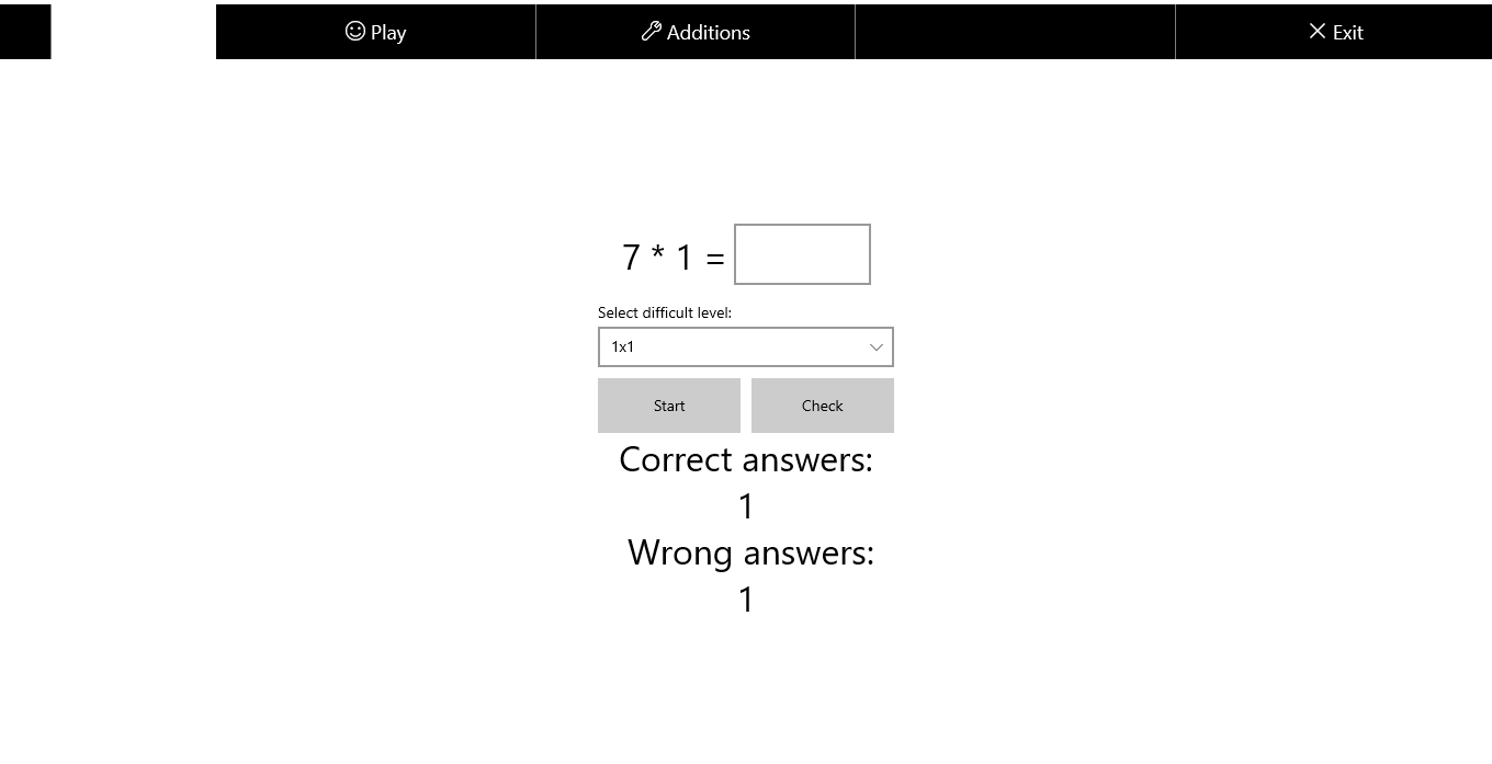 To begin development, you just need to select the difficulty level and click the "Start" button. After that, you will already be offered an example for which you need to give an answer! To check the answer, click the "Check" button.