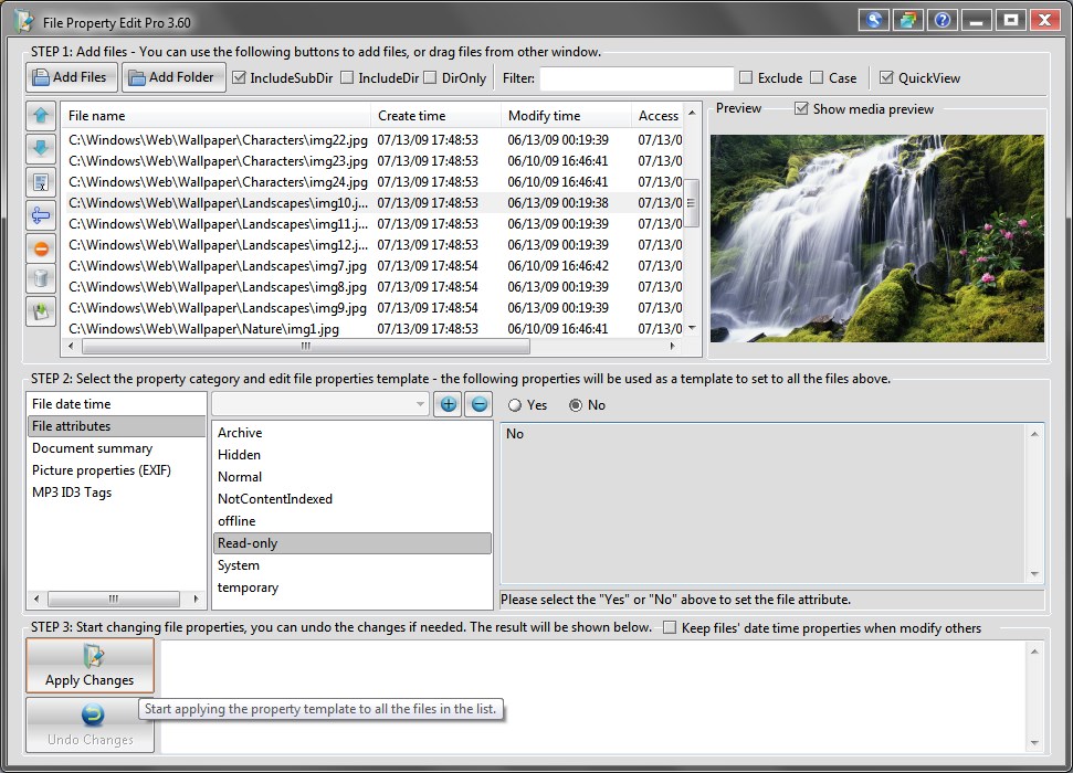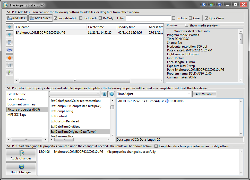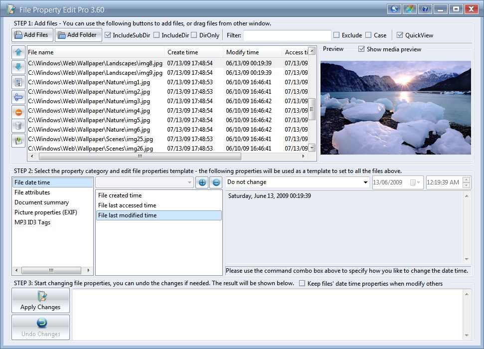 With just several clicks, you can easily change the files' attributes, including "create time", "modify time", "last access time", "read-only", "hidden", "system"... and modify their properties, such as document summary properties, photo's EXIF properties, MP3 ID3 tags (V1 and V2), and AVI RIFF Info tags. With the powerful file and folder browse feature and the drag and drop support, you can add a group of files and directories. The 1-click Undo feature allows you to rollback all the changes you just made. It also supports quick preview feature, which allows you to see the picture's thumbnail while you edit it, and the export properties feature, which allows you to export the file properties into XML file or CSV file.