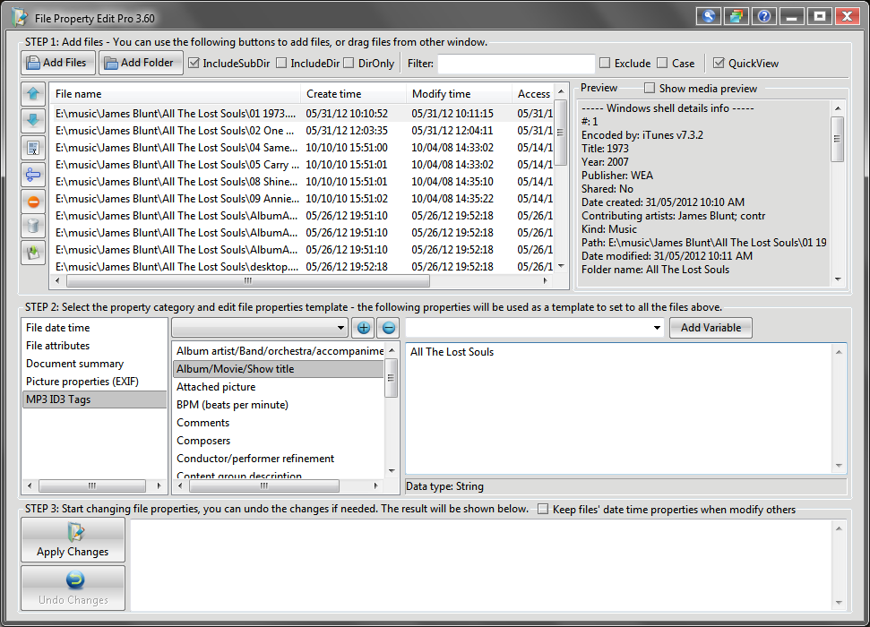 Edit MP3 ID3 Tags including V1 and V2.Edit all types of photo\'s properties including EXIF.Edit the file\'s summary properties including: "Title", "Subject", "Author", "Keywords", "Comments", "Template", "Last Author", "Revision Number", and "App Name".QuickView feature - support thumbnail preview and shell details info .Undo changes: After you change the properties of files and folders, you can use this feature to cancel the changes, and rollback to the old property values. Edit AVI files\' RIFF info tags, include title, copyright, year, genre, artist ...Support replace or remove part of the content in file properties.Support use variables to change file and folder\'s date time attributes.Support use variables to change file properties, e.g. add current date time, number series, datetime series, and use variables to increase or decrease the property value in number or datetime fields.Support use file\'s name or folder name as variable to change file properties.Support export properties feature, you can export file properties into XML or CSV file.Drag and Drop support: It\'s easy to add files to the list, just drag files from anywhere and drop them to File Property Edit\'s list.Change file and folder\'s attributes including "Archive", "Read Only", "Hidden", "System", "Temporary", "Offline", "Content index", or "Normal".Change file and folder\'s "created date time", "modified date time", and "Last access date time".