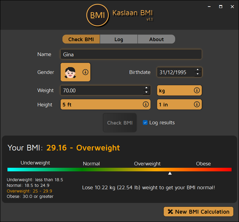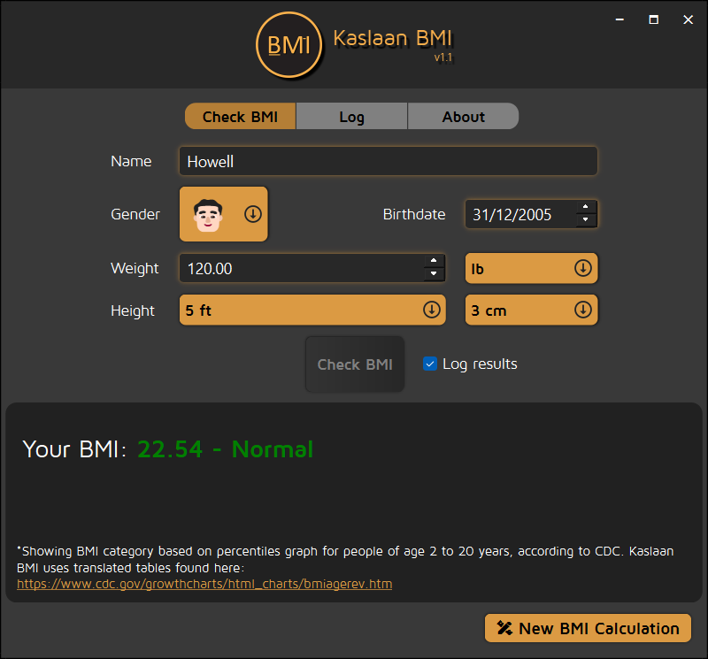 Ground-up rebuild of original Kaslaan BMI. Bringing you more features and more reliable user experience. Can now find BMI category of non-adults, male and female, of age 2 to 20 years, using Percentile graphs, published by CDC (cdc.gov). Now can track BMI in better way and for multiple users.