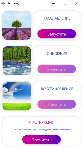 Приложение «Гармония» создана в помощь людям, которые ведут активный образ жизни и хотели бы оптимизировать процессы восстановления организма в мобильных условиях. Это возможно с помощью приложения, установленного на компьютер или смартфон.