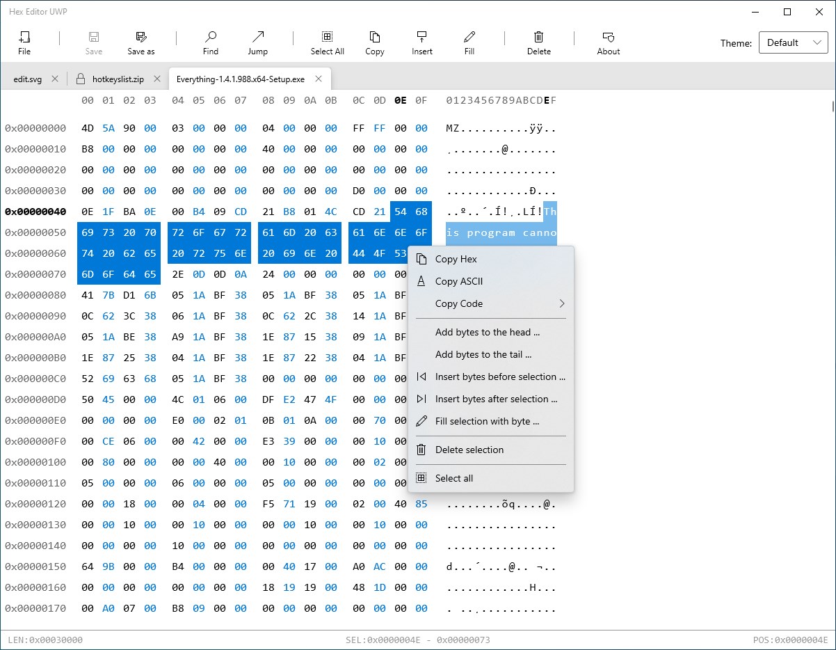 - Beautiful and practical color matching makes editing and browsing more accurate.- Support multiple files that can be opened at the same time.- Support to create memory files and save them after editing.- If you want to select multiple bytes, you can just use the mouse to select.- In single byte selection mode, the following operations can be performed Use the up, down, left, and right key of the keyboard to move the selection position. Use the keyboard 0-9, A-F to edit the selected byte- Context menu that is very useful at any time- The selected bytes can be copied into code, languages include C, C#, Java, Javascript and Python.- You can choose to open the file in read-only mode to prevent the file itself from being modified by mistake.