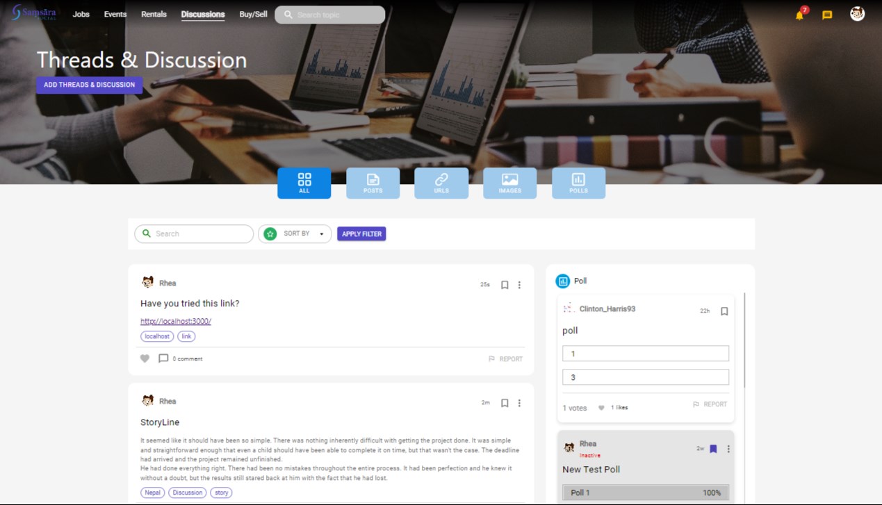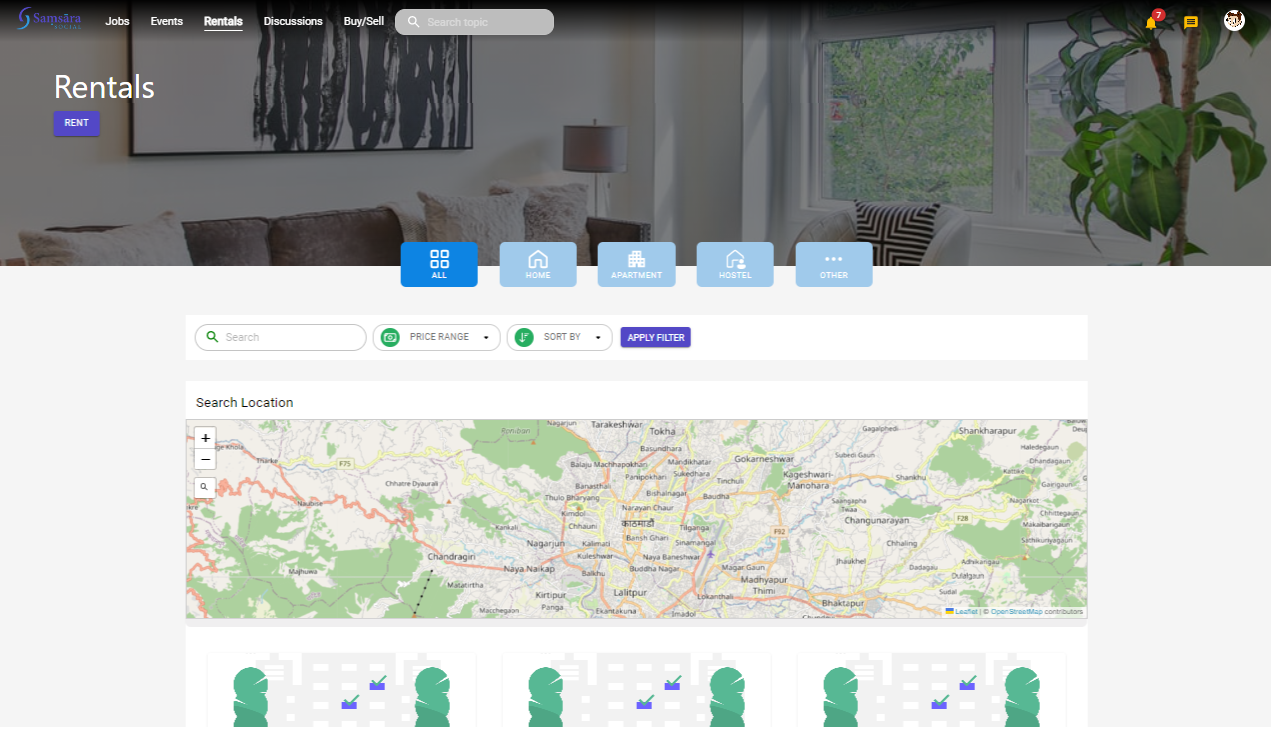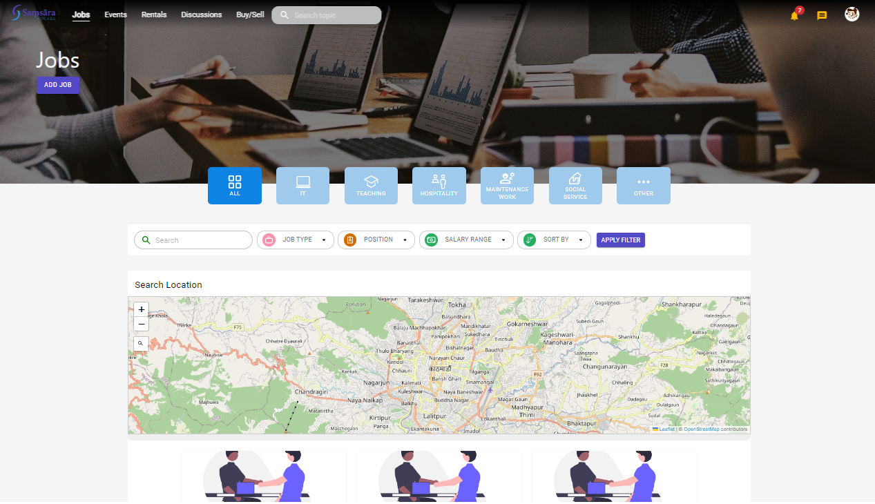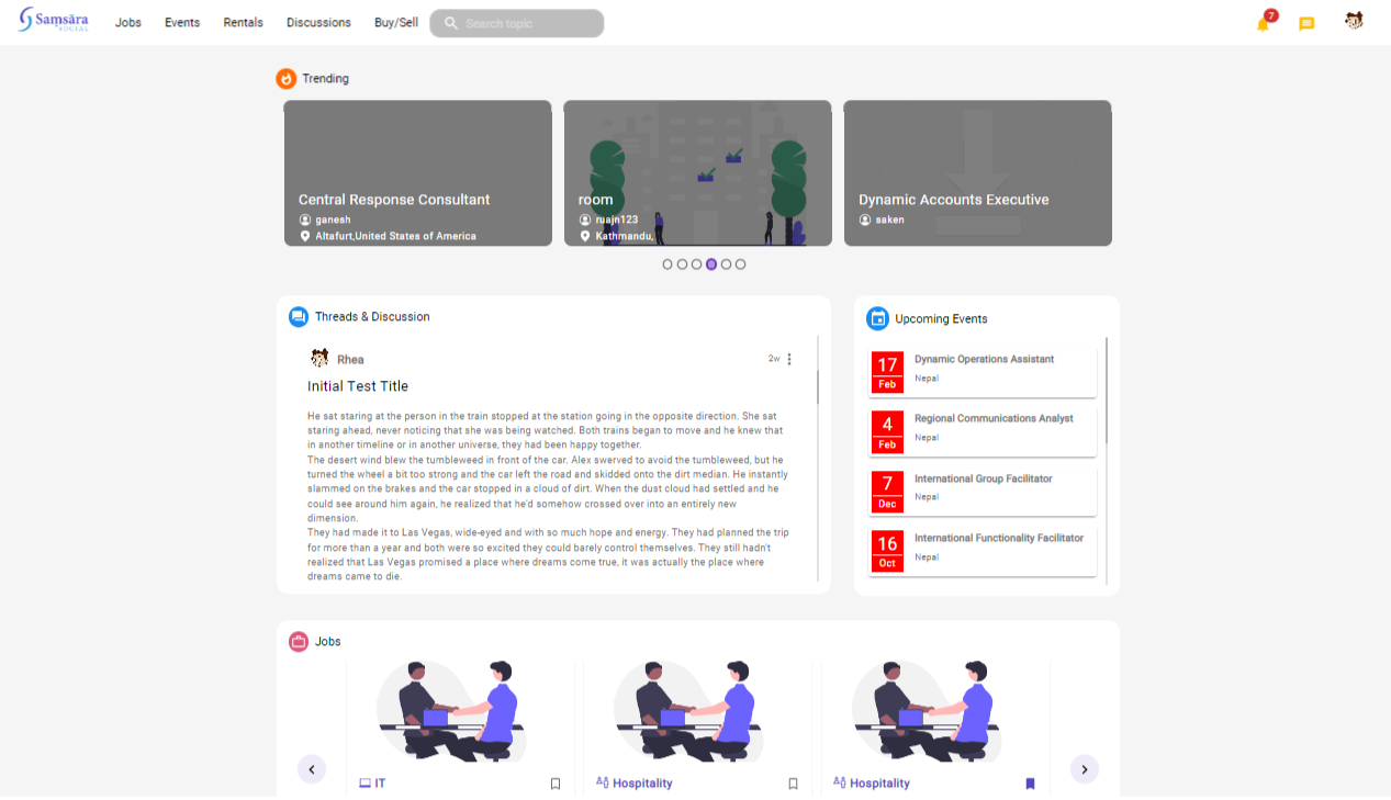 Samsara social is a web portal connecting people where you can list or apply for jobs, rent a place, buy or sell everyday products, and also get involved in immersive discussions all under one roof.