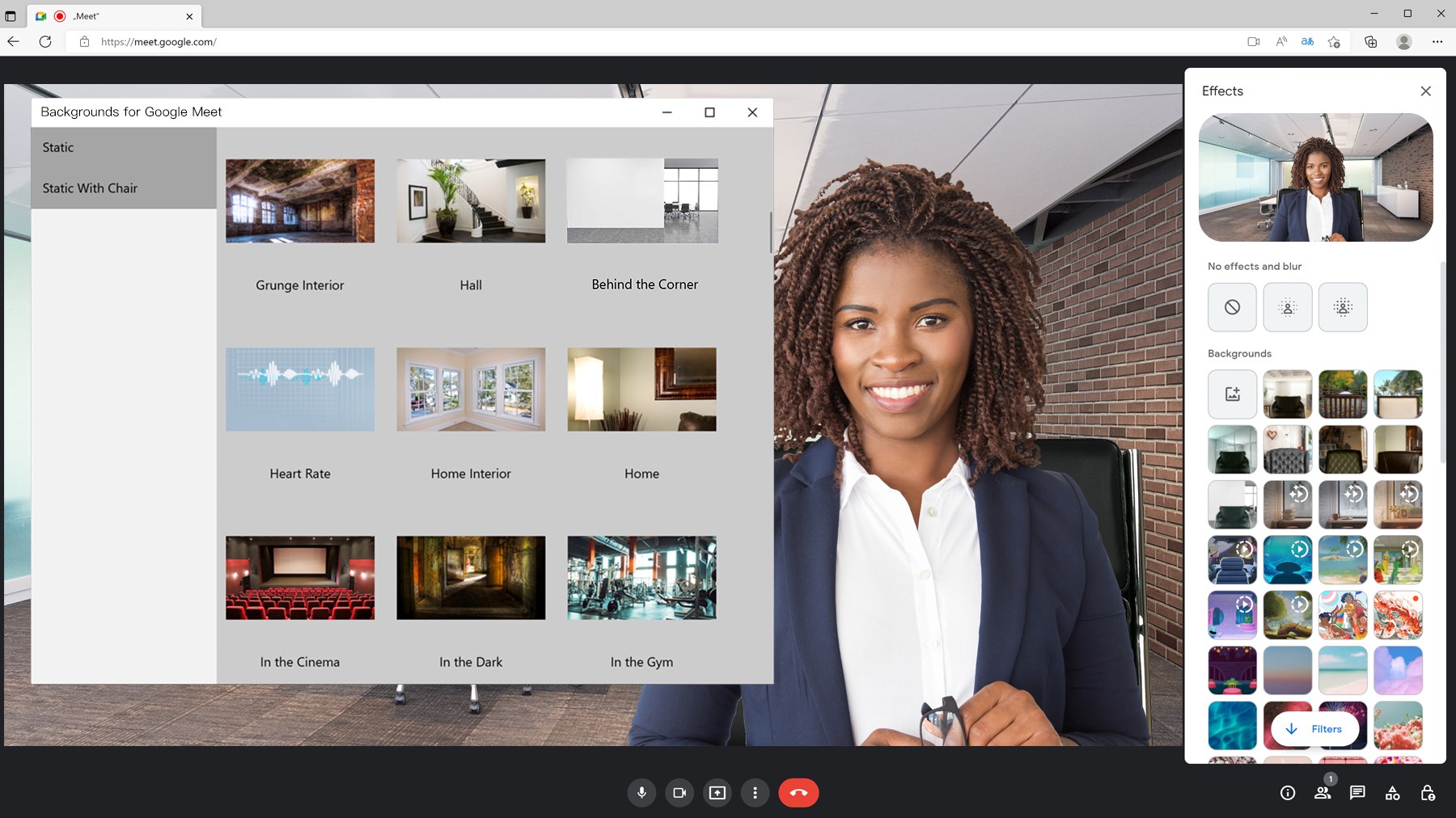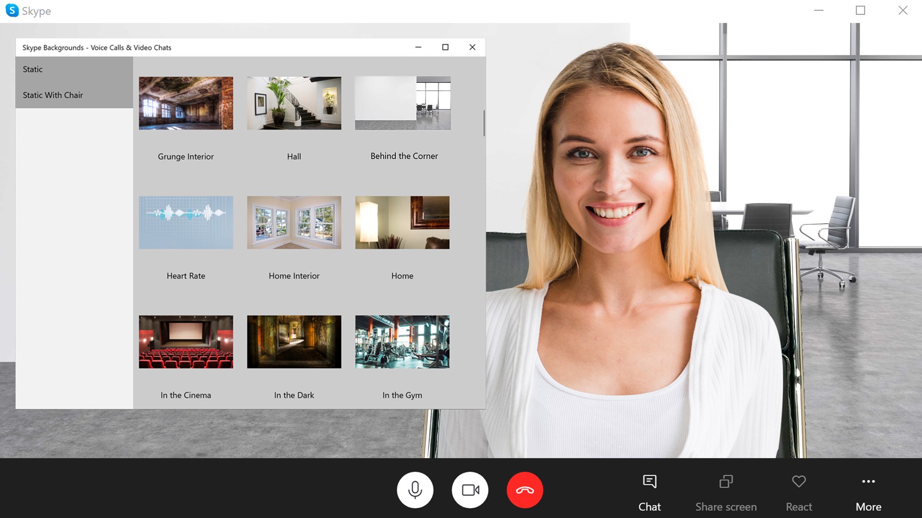 Realistic backgrounds tuned for Zoom, Skype or Google Meet.