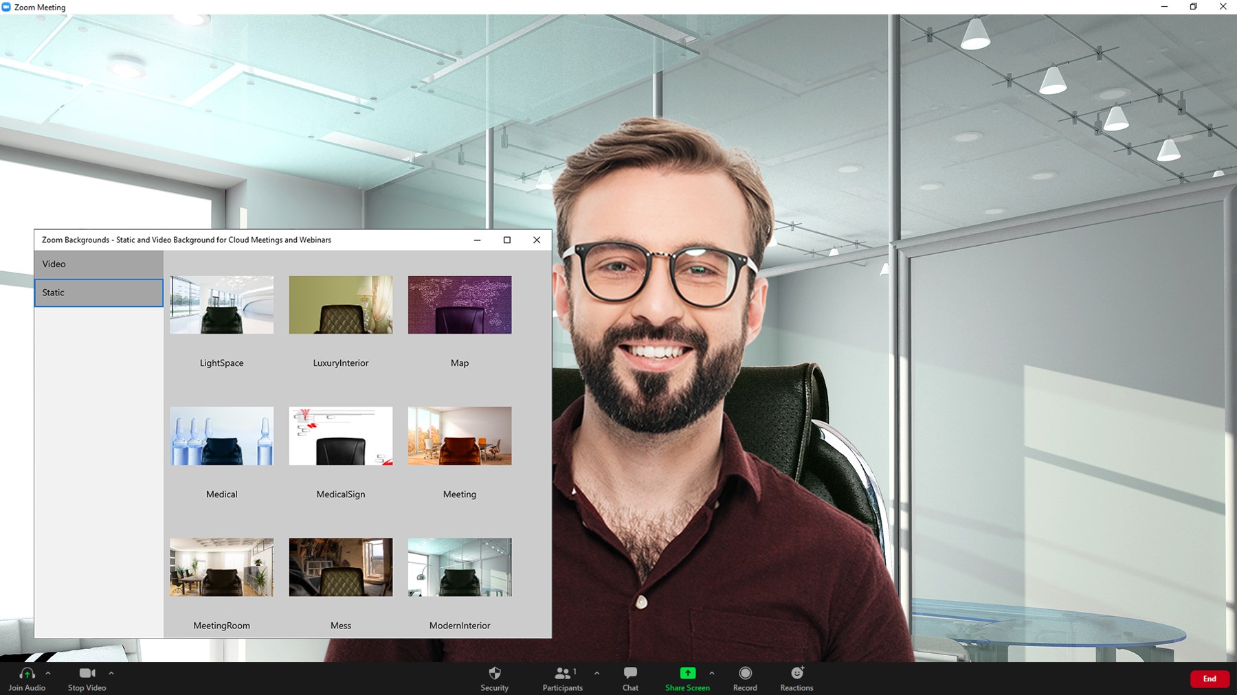 Easily changeable backgrounds for unforgettable video conferences with professionally designed videos and pictures.