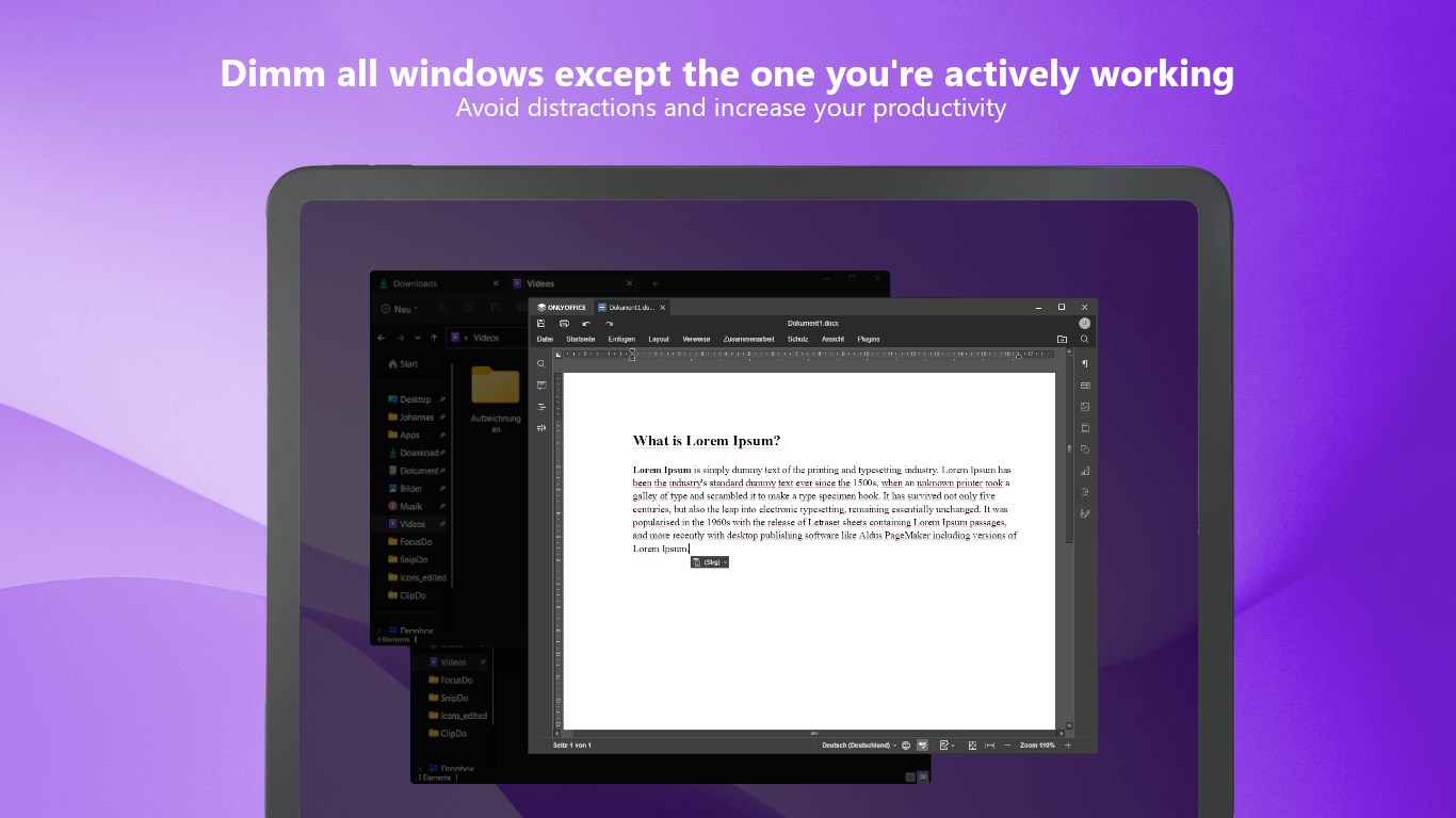 FocusDo helps you stay focused on the task at hand by dimming all windows except the one you're actively working in. This can help you avoid distractions like seeing e-mails pop up in the background so you can increase your productivity and get your work done faster. There are multiple options for dimming, making this app an efficient way to manage your desktop distractions.