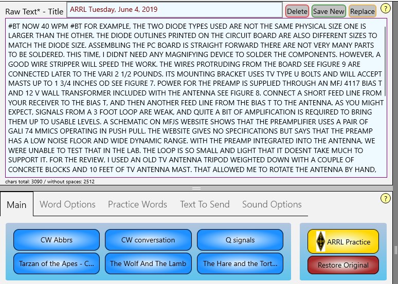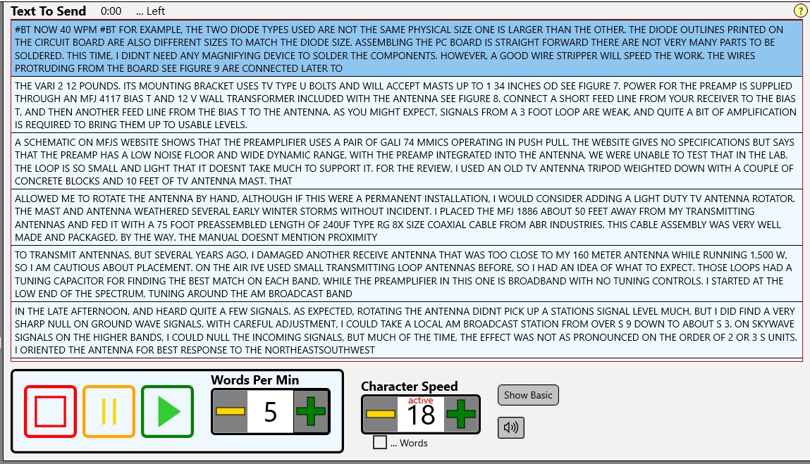 A comprehensive training system for learning Morse Code. Learn the characters at full speed, then practice with the included text, or any text of your own.