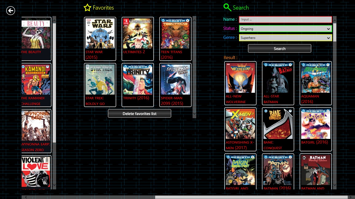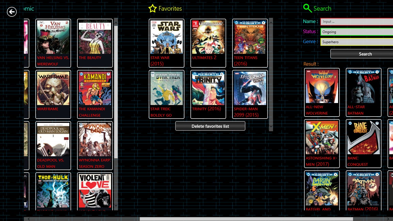 All comic in Comic 4ever Pro is the best , most popular and has awards like : Star Wars , Avengers , Justice League , X-Men , Tintin , Lucky Luke , Spirou And Fantasio , Asterix And Obelisk , Smurfs , Garfield , Dreed , Watchmen , Star Trek , The Walking Dead , Darth Vader , Batman , Superman , Wonder Woman , Flash , Cyborg , Aquaman , Green Lantern , Martian Manhunter , Shazam , Teen Titans , Spider-Man , Fantastic Four , Captain America , Iron Man , Hulk , Thor , Vision , Scarlet Witch , Doctor Strange , Black Panther , Hawkeye , Black Widow , Wolverine , Professor X , Magneto , Mystique , Jean Grey , Cyclops , Storm , Iceman , Angel , Beast , Rogue , Deadpool , Suicide Squad , Jorker , Lex Luthor , Anti-Monitor , Darkseid , Harley Quinn , Inhumans , Thanos , Apocalypse , Ultron , Loki , Supergirl , Power Girl , Catwoman , Poison Ivy , Doctor Doom , Captain Marvel , Kitty Pryde , Silver Surfer , Nick Fury , Iron Fist , Robin , Nightwing , Venom , Spawn , Hellboy , Emma Frost , Swamp Thing , John Constantine ...