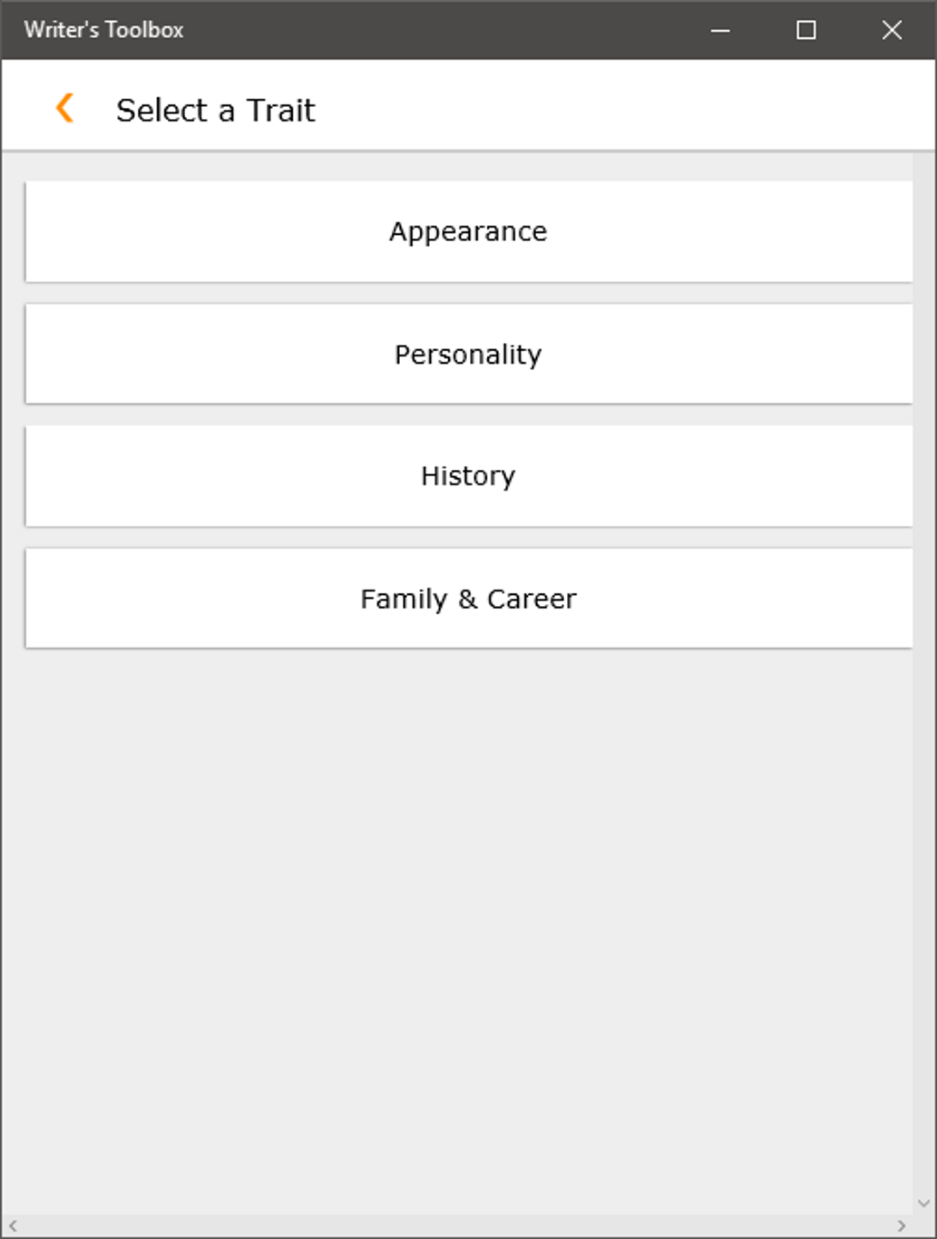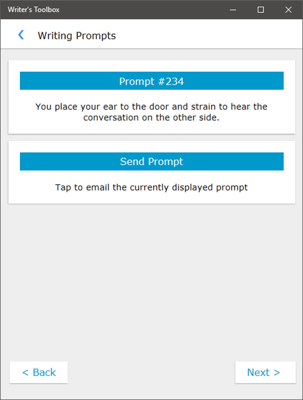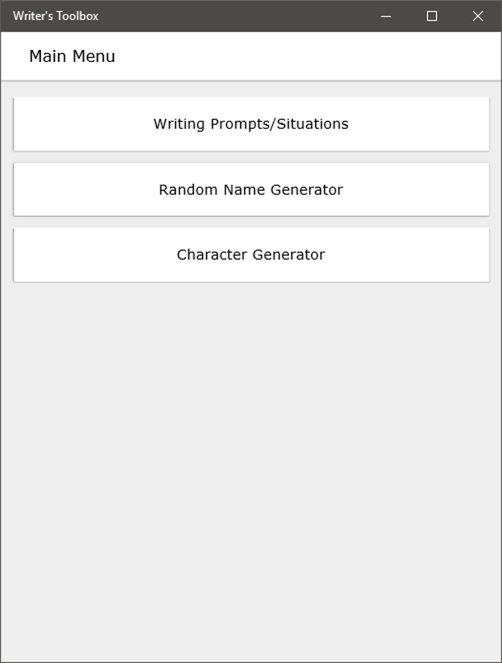 Writer's Toolbox gives you a variety of generators to help with your story. The writing prompt generator provides situations to keep your story moving, the random name generator provides high quality names in several languages, and the character generator provides detailed aspects of your story's characters.
