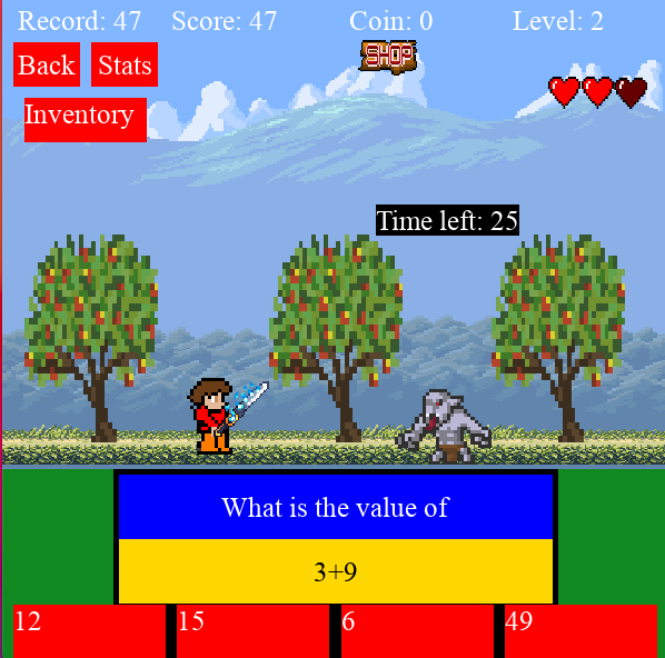 The whole concept of “Retro Math,” the math game app I developed, is to make math more entertaining to children of any age, especially students who loathe studying math but love computer games. Retro Math is very unique because it merges solving math problems with the fun of playing combat games, hopefully creating associations for students between having fun and learning math. Students defeat enemies and earn coins if they solve math problems within a fixed time frame. After acquiring a certain amount of coins, they are able to buy items to strengthen their avatars. They can choose the difficulty level of the math questions starting with simple questions and then progress to much more difficult questions. If they cannot answer a question correctly, the application redirects them to a website that teaches them simple methods of solving each problem.
