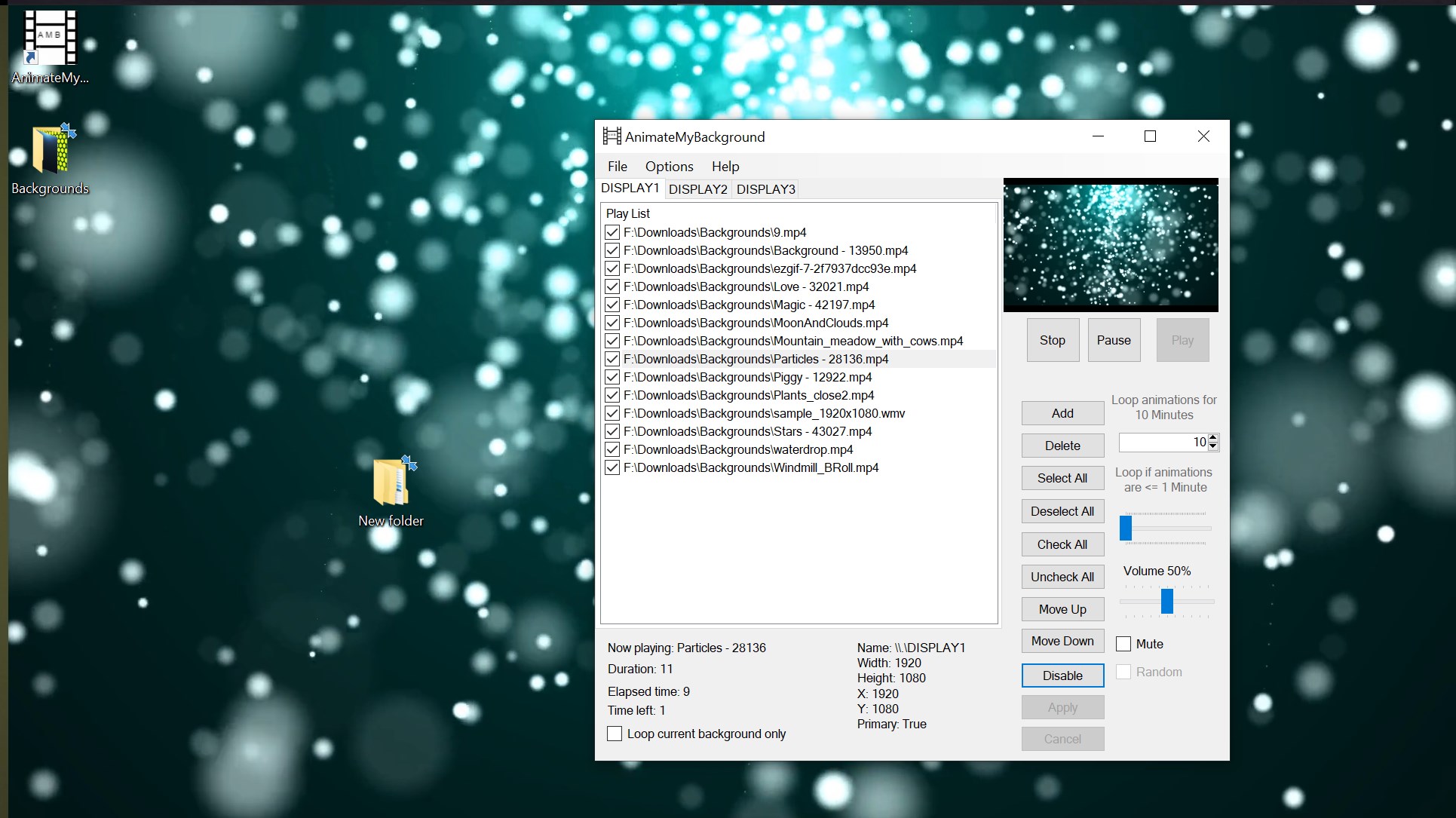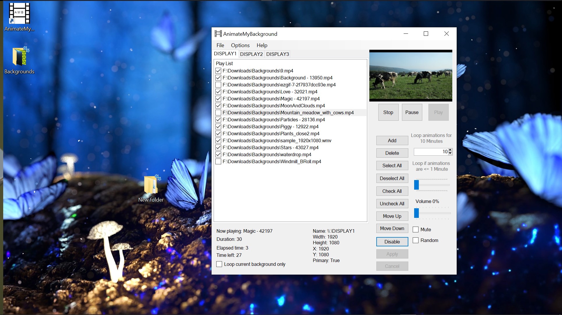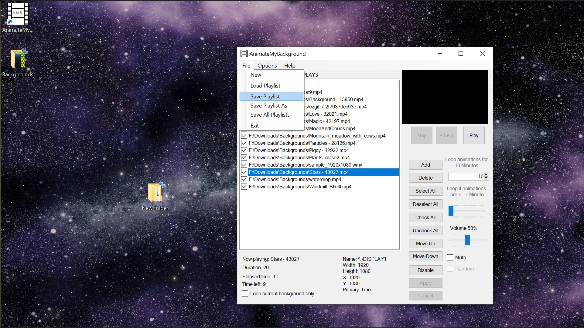 What this program can do is let you make a playlist or use the built in one that come with it, select the files you would like to be played in the list or just have a single file on a continuous loop, apply all your changes and make sure its enabled and you are good to go, the program will handle the rest and place it as the desktop background on each of the Displays you have connected.