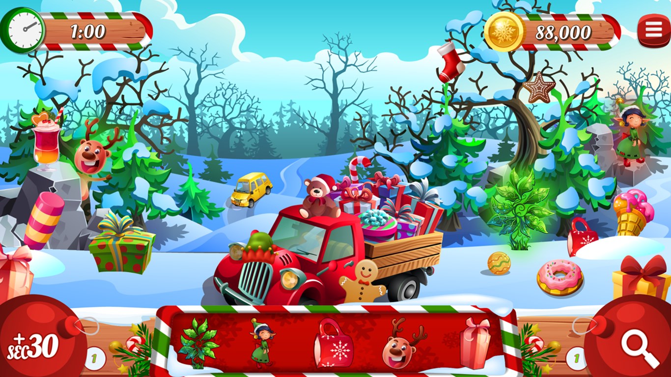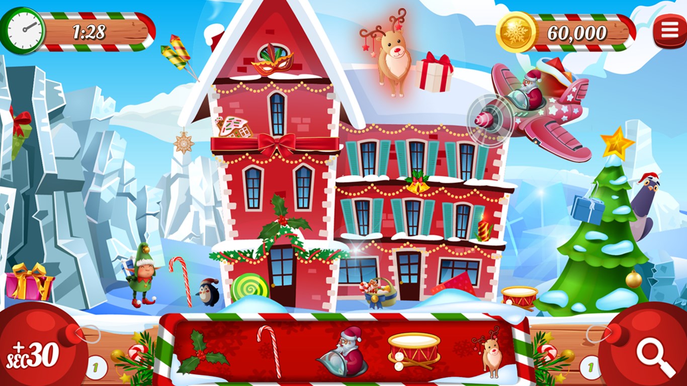 Hidden Surprises: Search through snowy scenes for jolly Christmas items!Time Challenge – Beat the Clock!Hint and Extra time features