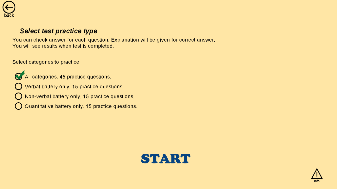 App provides you with practice mode where you can check for correct answers while you are taking the test, and you can select to focus on specific areas to practice. Here you will get immediate feedback if selected answer is the correct one.