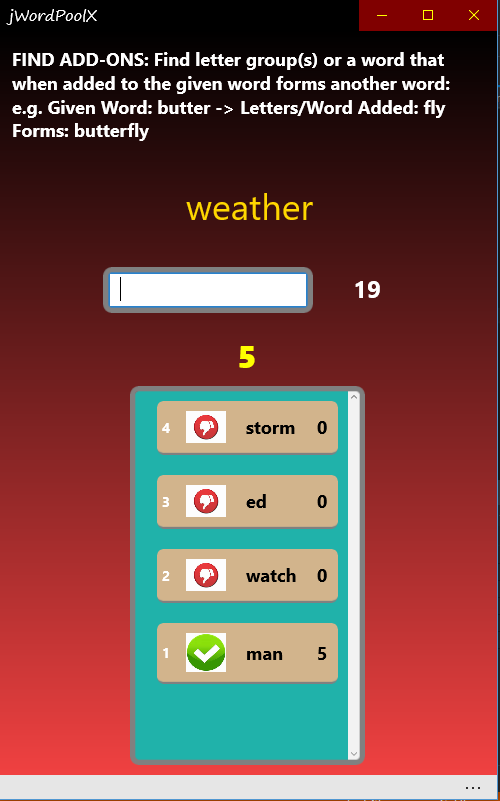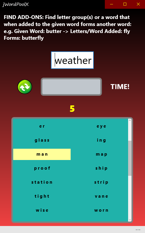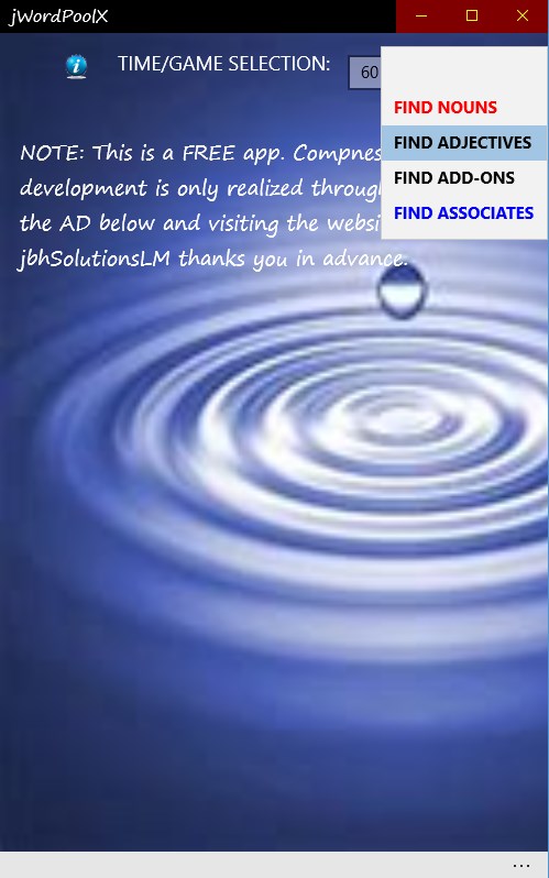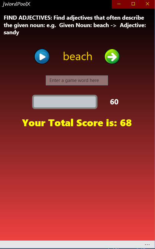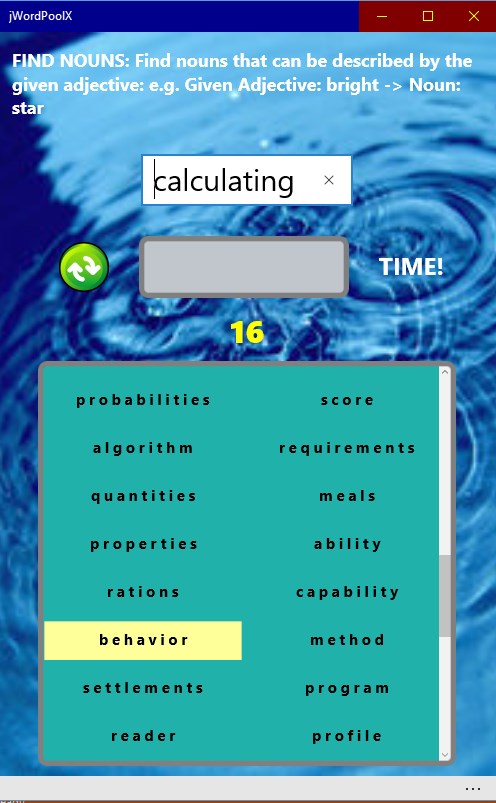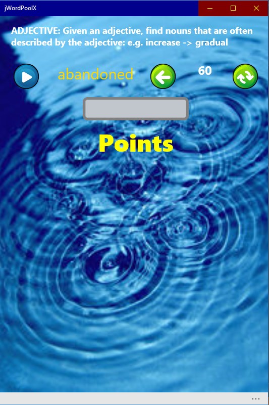 WordPool is a word association game. It provides five types of word associations to be made based on a user selectable time limit. The application will randomly select a word for the player to attempt to enter as many associations with that word. The player will be awarded points for the word entered using the Scrabble word scoring method. When the time expires for the game played a list will be displayed of all possinble selections for the word association. The players score will be accumulated with each round played.