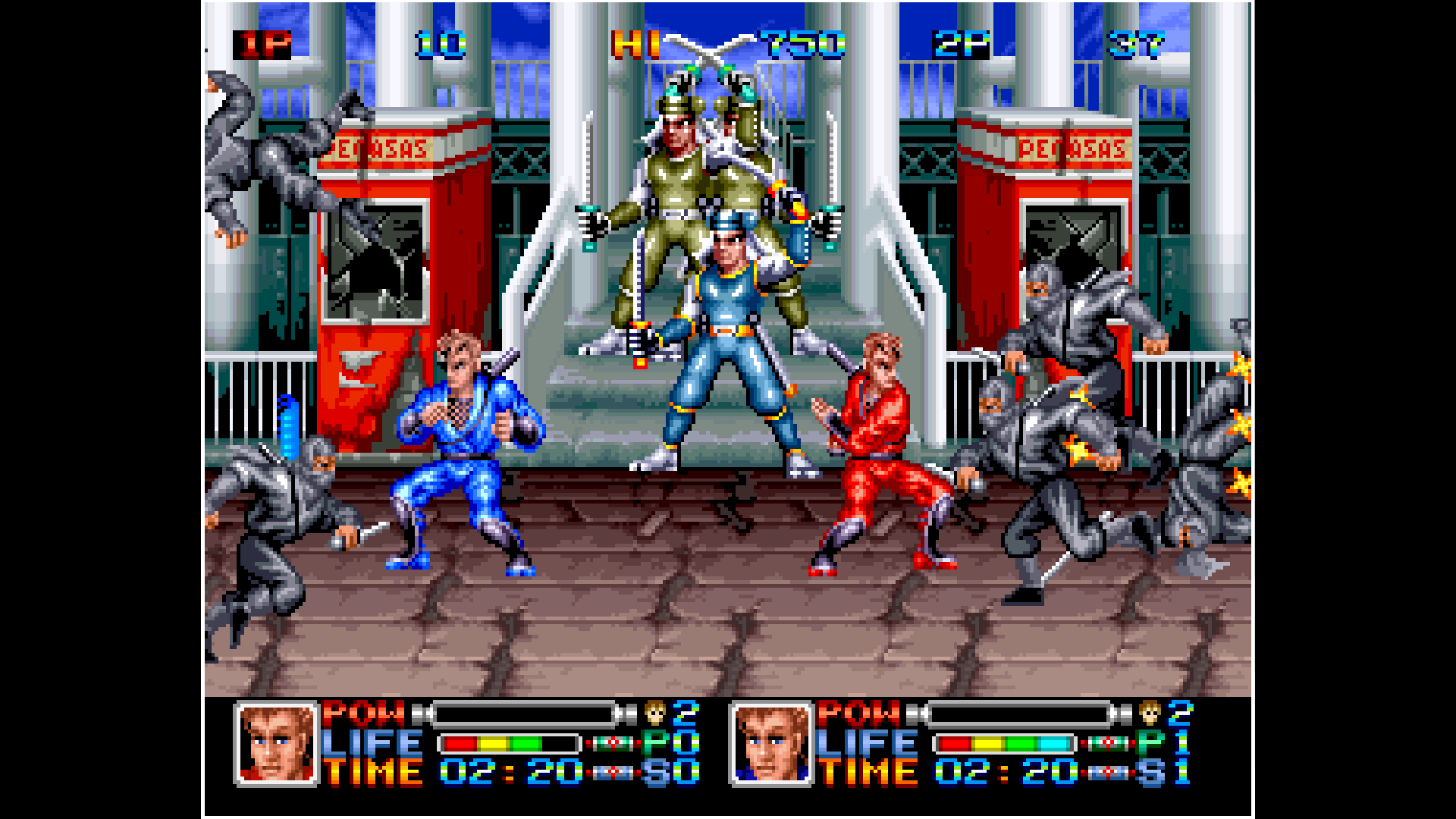 NINJA COMBAT is an action game released in 1990 by SNK. In order to defeat the evil ninja clan KAGE ICHIZOKU, justice-seeking ninjas head towards NINJA TOWER. Enjoy battling with a wide array of weapons and Ninja Magic as well as the ability for a friend to join in on the action.