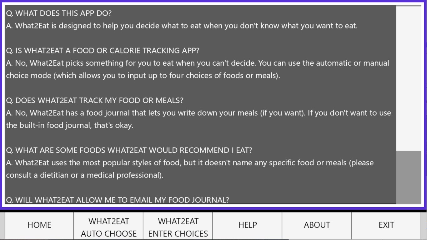 What2Eat also can document your food journal using either of the two food journals. On Windows versions of What2Eat, your food journals, and colors can be saved to your Windows operating system. Also, on the Windows versions of What2Eat, you can change the background color of What2Eat.
