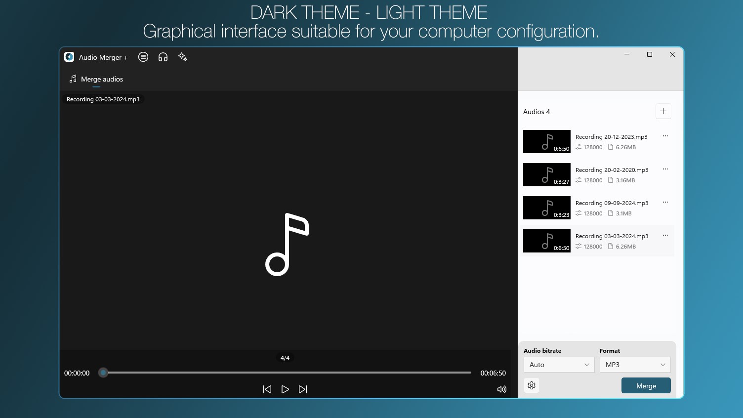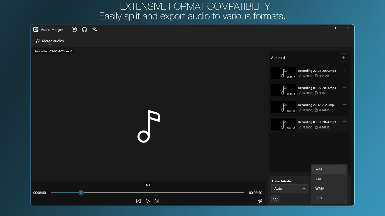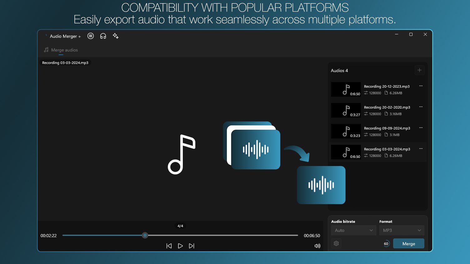 Merge music and audio into one file, support MP3, FLAC, WAV, AAC and more.Merge mp3